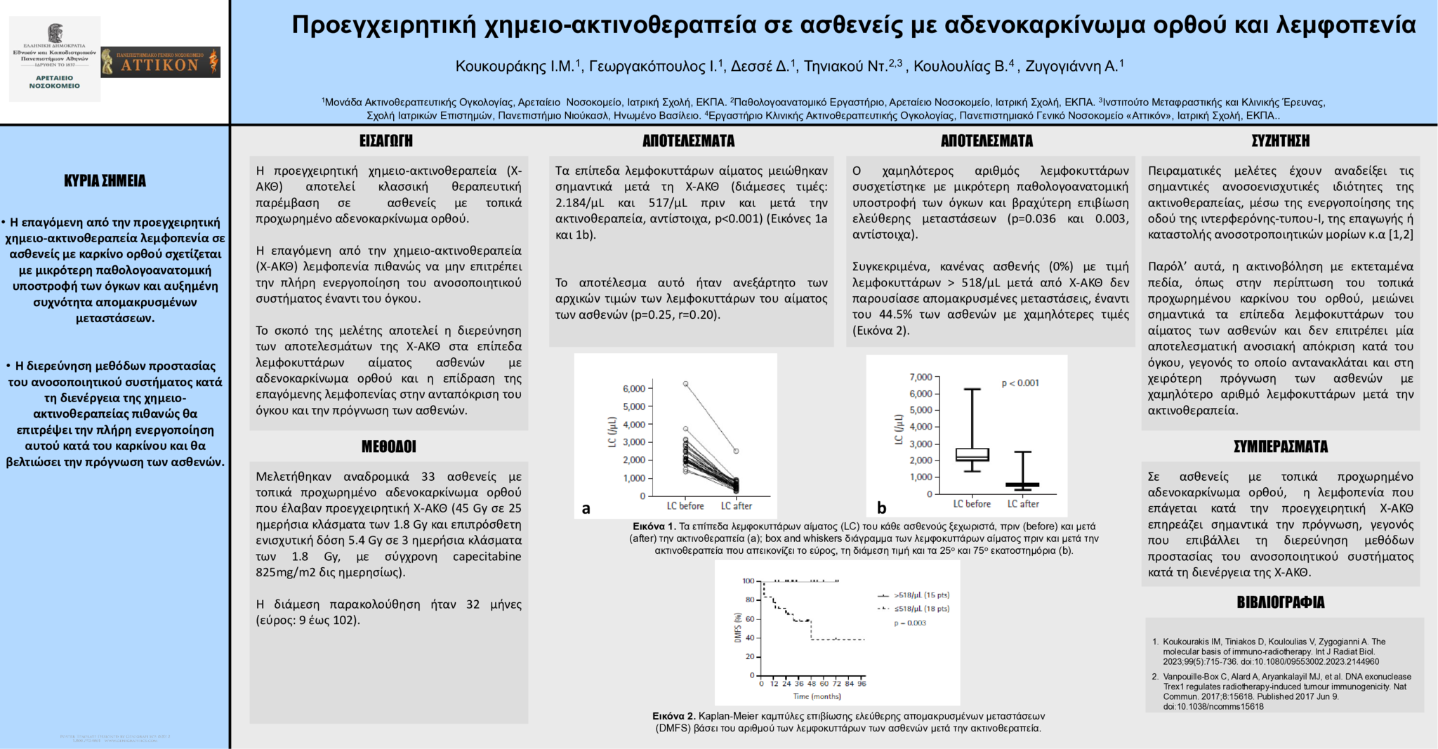 Εισαγωγή: Η προεγχειρητική χημειο-ακτινοθεραπεία (Χ-ΑΚΘ) αποτελεί κλασσική θεραπευτική παρέμβαση σε ασθενείς με τοπικά προχωρημένο αδενοκαρκίνωμα ορθού. H επαγόμενη από την χημειο-ακτινοθεραπεία (Χ-ΑΚΘ) λεμφοπενία πιθανώς να μην επιτρέπει την πλήρη ενεργοποίηση του ανοσοποιητικού συστήματος έναντι του όγκου. Σκοπός: Η διερεύνηση των αποτελεσμάτων της Χ-ΑΚΘ στα επίπεδα λεμφοκυττάρων αίματος ασθενών με αδενοκαρκίνωμα ορθού και η επίδραση της επαγόμενης λεμφοπενίας στην ανταπόκριση του όγκου και την πρόγνωση των ασθενών. Μέθοδοι: Μελετήθηκαν αναδρομικά 33 ασθενείς με τοπικά προχωρημένο αδενοκαρκίνωμα ορθού που έλαβαν προεγχειρητική Χ-ΑΚΘ (45 Gy σε 25 ημερήσια κλάσματα των 1.8 Gy και επιπρόσθετη ενισχυτική δόση 5.4 Gy σε 3 ημερήσια κλάσματα των 1.8 Gy, με σύγχρονη capecitabine 825mg/m2 δις ημερησίως) και παρακολουθήθηκαν για 32 (9 έως 102) μήνες. Αποτελέσματα: Τα επίπεδα λεμφοκυττάρων αίματος μειώθηκαν σημαντικά μετά τη Χ-ΑΚΘ (διάμεσες τιμές: 2.184/μL και 517/μL πριν και μετά την ακτινοθεραπεία, αντίστοιχα, p<0.001). O χαμηλότερος αριθμός λεμφοκυττάρων συσχετίστηκε με μικρότερη παθολογοανατομική υποστροφή των όγκων και μικρότερη επιβίωση ελεύθερης μεταστάσεων (p=0.036 και 0.003, αντίστοιχα). Συγκεκριμένα, κανένας ασθενής (0%) με τιμή λεμφοκυττάρων > 518/μL μετά από Χ-ΑΚΘ δεν παρουσίασε απομακρυσμένες μεταστάσεις, έναντι του 44.5% των ασθενών με χαμηλότερες τιμές. Συμπεράσματα: Σε ασθενείς με τοπικά προχωρημένο αδενοκαρκίνωμα ορθού, η λεμφοπενία που επάγεται κατά την προεγχειρητική Χ-ΑΚΘ επηρεάζει σημαντικά την πρόγνωση, γεγονός που επιβάλλει τη διερεύνηση μεθόδων προστασίας του ανοσοποιητικού συστήματος κατά τη διενέργεια της Χ-ΑΚΘ.