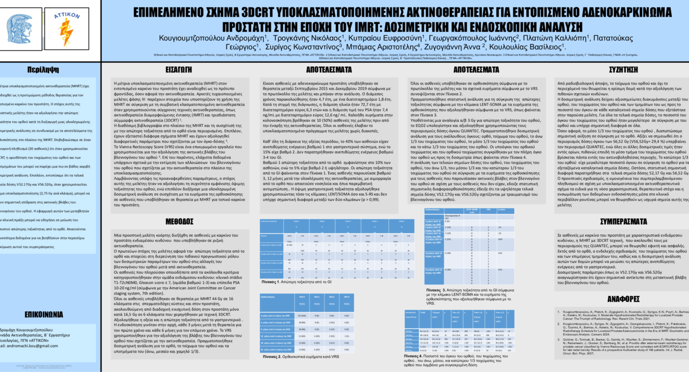 Εθνικό και Καποδιστριακό Πανεπιστήμιο Αθηνών, Ιατρική Σχολή, Β Εργαστήριο Ακτινολογίας, Μονάδα Ακτινοθεραπείας, ΠΓΝΑ «ΑΤΤΙΚΟΝ». ePosters Κουγιουμτζοπούλου Ανδρομάχη ΕΠΙΜΕΛΗΜΕΝΟ ΣΧΗΜΑ 3DCRT ΥΠΟΚΛΑΣΜΑΤΟΠΟΙΗΜΕΝΗΣ ΑΚΤΙΝΟΘΕΡΑΠΕΙΑΣ ΓΙΑ ΕΝΤΟΠΙΣΜΕΝΟ ΑΔΕΝΟΚΑΡΚΙΝΩΜΑ ΠΡΟΣΤΑΤΗ ΣΤΗΝ ΕΠΟΧΗ ΤΟΥ IMRT: ΔΟΣΙΜΕΤΡΙΚΗ ΚΑΙ ΕΝΔΟΣΚΟΠΙΚΗ ΑΝΑΛΥΣΗ / Ακτινοθεραπεία-Ακτινοχειρουργική