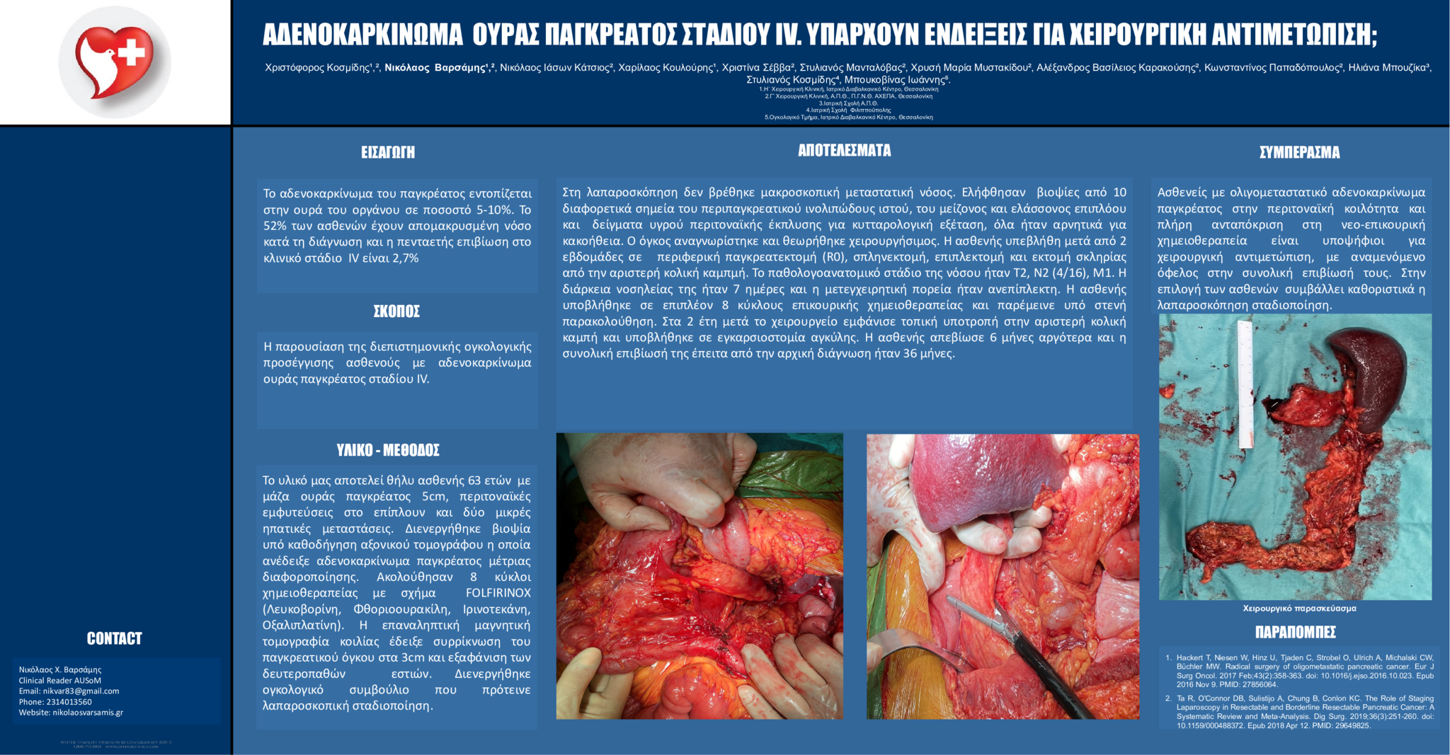 Συμπεράσματα: Ασθενείς με ολιγομεταστατικό αδενοκαρκίνωμα παγκρέατος στην περιτοναϊκή κοιλότητα και πλήρη ανταπόκριση στη νεο-επικουρική χημειοθεραπεία είναι υποψήφιοι για χειρουργική αντιμετώπιση, με αναμενόμενο όφελος στην συνολική επιβίωσή τους. Στην επιλογή των ασθενών  συμβάλλει καθοριστικά η λαπαροσκόπηση σταδιοποίηση.