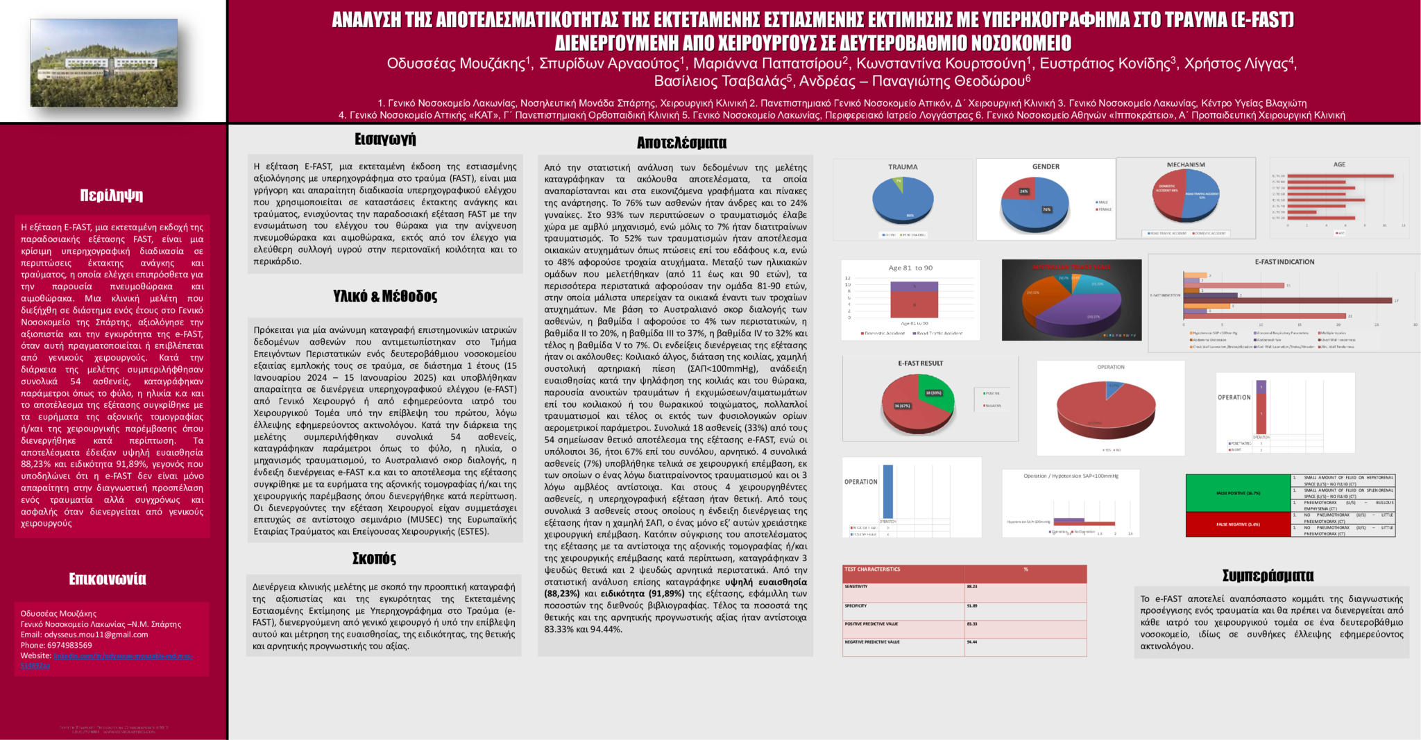 Πρόκειται για μία ανώνυμη καταγραφή επιστημονικών ιατρικών δεδομένων ασθενών που αντιμετωπίστηκαν στο Τμήμα Επειγόντων Περιστατικών toyεξαιτίας εμπλοκής τους σε τραύμα, σε διάστημα 1 έτους (15 Ιανουαρίου 2024 – 15 Ιανουαρίου 2025) και υποβλήθηκαν απαραίτητα σε διενέργεια υπερηχογραφικού ελέγχου (e-FAST) από Γενικό Χειρουργό ή από εφημερεύοντα ιατρό του Χειρουργικού Τομέα υπό την επίβλεψη του πρώτου, λόγω έλλειψης εφημερεύοντος ακτινολόγου. Κατά την διάρκεια της μελέτης συμπεριλήφθηκαν συνολικά 54 ασθενείς, καταγράφηκαν παράμετροι όπως το φύλο, η ηλικία, ο μηχανισμός τραυματισμού, το Αυστραλιανό σκορ διαλογής, η ένδειξη διενέργειας e-FAST κ.α και το αποτέλεσμα της εξέτασης συγκρίθηκε με τα ευρήματα της αξονικής τομογραφίας ή/και της χειρουργικής παρέμβασης όπου διενεργήθηκε κατά περίπτωση. Οι διενεργούντες την εξέταση Χειρουργοί είχαν συμμετάσχει επιτυχώς σε αντίστοιχο σεμινάριο (MUSEC) της Ευρωπαϊκής Εταιρίας Τραύματος και Επείγουσας Χειρουργικής (ESTES).
