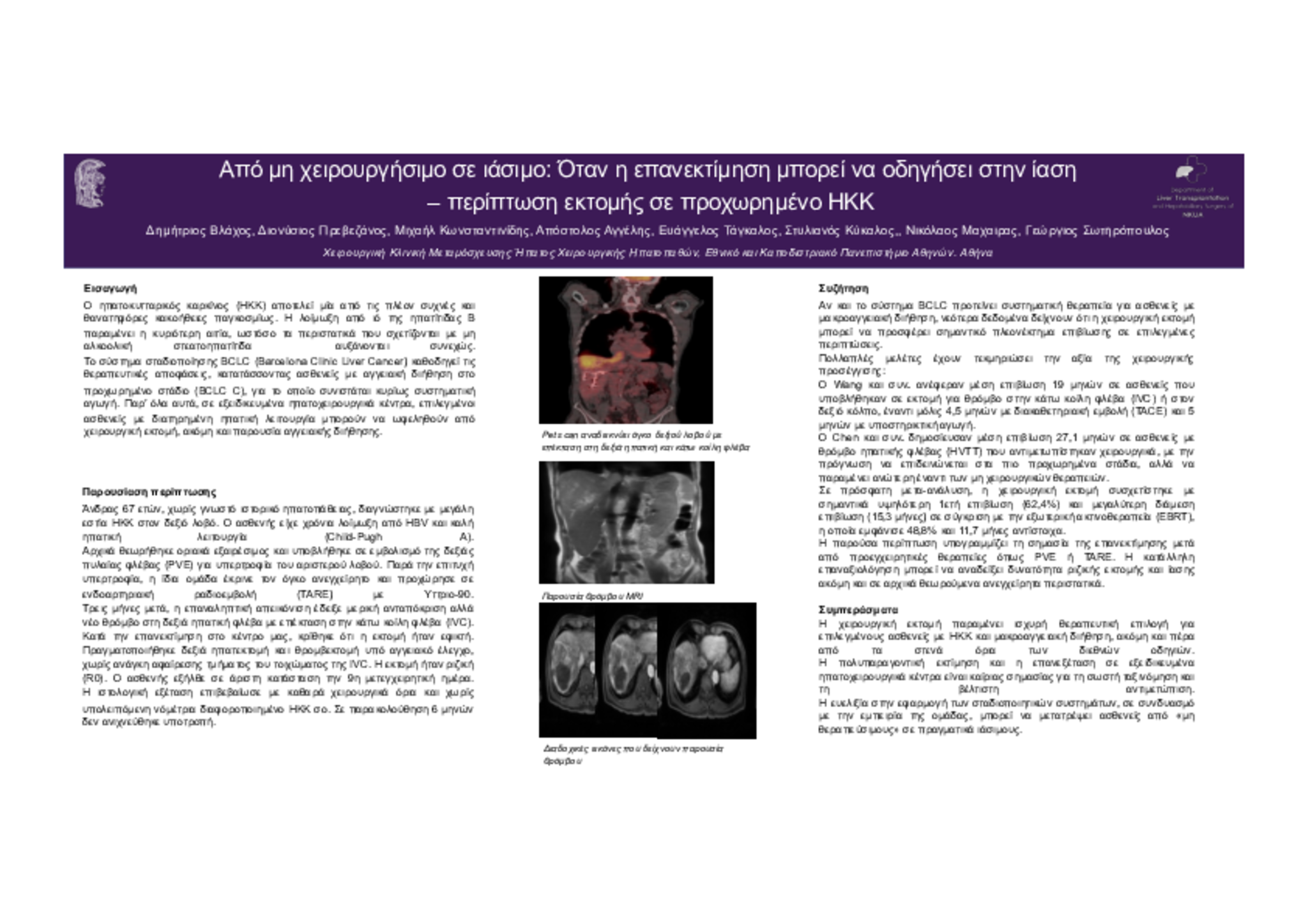 Ένας 67χρονος άνδρας με χρόνια HBV λοίμωξη διαγνώστηκε με μεγάλη, μονήρη μάζα στον δεξιό λοβό του ήπατος, με διατηρημένη ηπατική λειτουργία και χωρίς αγγειακή διήθηση. Αν και αρχικά θεωρήθηκε οριακά εξαιρέσιμος και υποβλήθηκε σε εμβολισμό δεξιάς πυλαίας φλέβας, στη συνέχεια κρίθηκε μη εξαιρέσιμος και αντιμετωπίστηκε παρηγορικά με ενδοαρτηριακή ραδιοεμβολή (TARE). Στην επανεξέταση μετά από 3 μήνες, η βλάβη εμφάνισε καλή ανταπόκριση αλλά πλέον συνοδευόταν από θρόμβο στη δεξιά ηπατική φλέβα και την κάτω κοίλη φλέβα (IVC). Στο εξειδικευμένο κέντρο μας κρίθηκε ότι ο όγκος ήταν εξαρχής εξαιρέσιμος και ότι η χειρουργική θεραπεία ήταν ακόμη εφικτή. Ο ασθενής υποβλήθηκε με επιτυχία σε δεξιά ηπατεκτομή και θρομβεκτομή, χωρίς επιπλοκές. Η ιστολογία επιβεβαίωσε πλήρη (R0) εξαίρεση. Στους 6 μήνες μετεγχειρητικής παρακολούθησης δεν υπήρχε ένδειξη υποτροπής.
