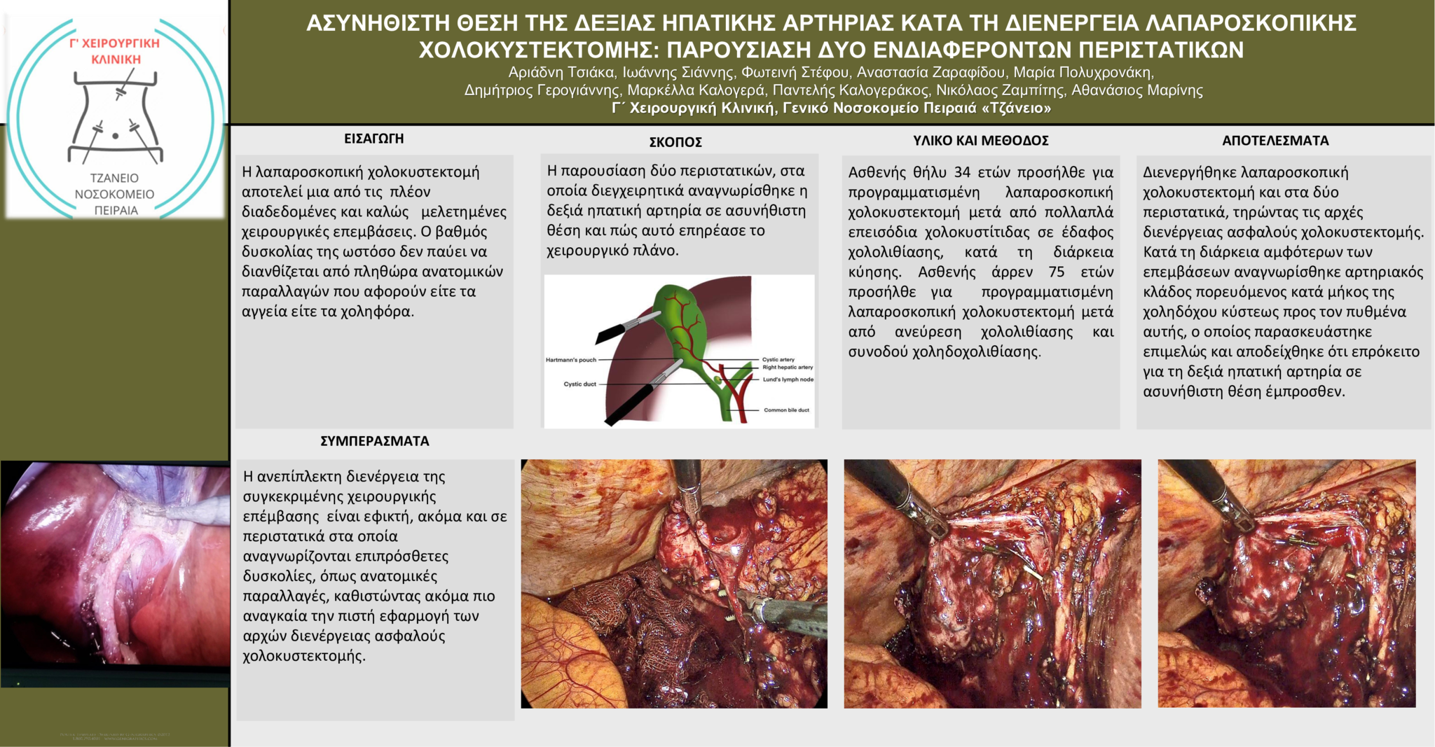 Συμπεράσματα: Η ανεπίπλεκτη διενέργεια της συγκεκριμένης χειρουργικής επέμβασης  είναι εφικτή, ακόμα και σε περιστατικά στα οποία αναγνωρίζονται επιπρόσθετες δυσκολίες, όπως ανατομικές παραλλαγές, καθιστώντας ακόμα πιο αναγκαία την πιστή εφαρμογή των αρχών διενέργειας ασφαλούς χολοκυστεκτομής.