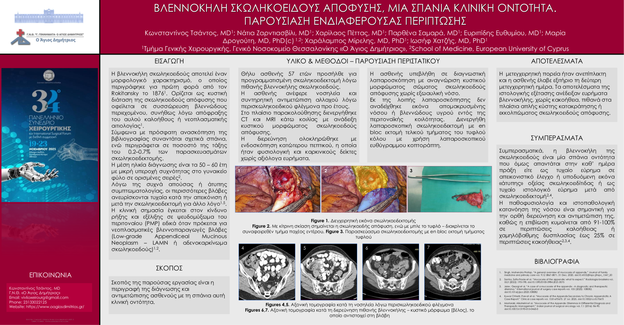 Θήλυ ασθενής 57 ετών προσήλθε για προγραμματισμένη χειρουργική αντιμετώπιση πιθανής βλεννοκήλης σκωληκοειδούς. Η ασθενής ανέφερε νοσηλεία και συντηρητική αντιμετώπιση plastron σκωληκοειδούς απόφυσης προ έτους. Στο πλαίσιο παρακολούθησης διενεργήθηκε CT και MRI κάτω κοιλίας με ανάδειξη κυστικού μορφώματος σκωληκοειδούς απόφυσης. Η διερεύνηση ολοκληρώθηκε με ενδοσκόπηση κατώτερου πεπτικού και καρκινικούς δείκτες χωρίς αξιόλογα ευρήματα. Η ασθενής υπεβλήθη σε διαγνωστική λαπαροσκόπηση με αναγνώριση κυστικού μορφώματος σώματος σκωληκοειδούς απόφυσης, χωρίς εικόνα νόσου ή βλέννης στην περιτοναϊκή κοιλότητα και πραγματοποιήθηκε λαπαροσκοπική σκωληκοειδεκτομή με en-block εκτομή τμήματος του τυφλού με χρήση λαπαροσκοπικού κοπτοράπτη.