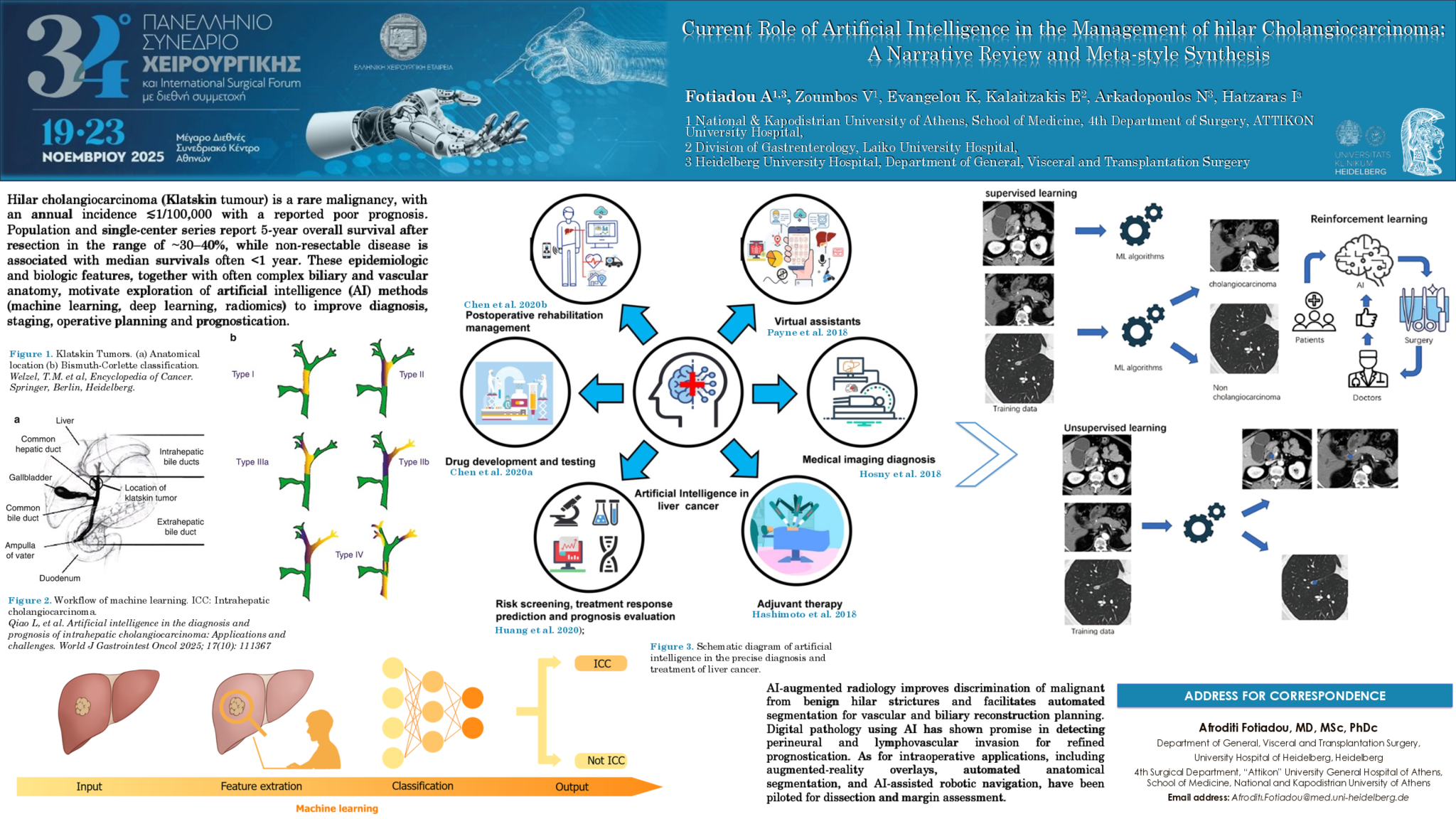 Results: AI-augmented radiology improves discrimination of malignant from benign hilar strictures and facilitates automated segmentation for vascular and biliary reconstruction planning. In a cohort of 274 patients, Quin et al. reported a multilevel radiomics–machine learning model predicting early recurrence with an AUC of 0.883, outperforming conventional staging. Similarly, Zhan et al. developed a CT-radiomics model for lymph node metastasis (n=214), achieving AUCs of 0.98 (training) and 0.87 (external validation), and stratifying survival (median 13.7 vs 27.3 months). Digital pathology using AI has shown promise in detecting perineural and lymphovascular invasion for refined prognostication. As for intraoperative applications, including augmented-reality overlays, automated anatomical segmentation, and AI-assisted robotic navigation, have been piloted for dissection and margin assessment. A single-center robotic series of 21 Klatskin patients achieved R0 resection in 90% with median blood loss of 150 mL and operative time of 458 minutes. A meta-analysis of 267 patients comparing robotic and open surgery found no significant differences in operative time, blood transfusion, R0 rates, or complications, supporting feasibility.