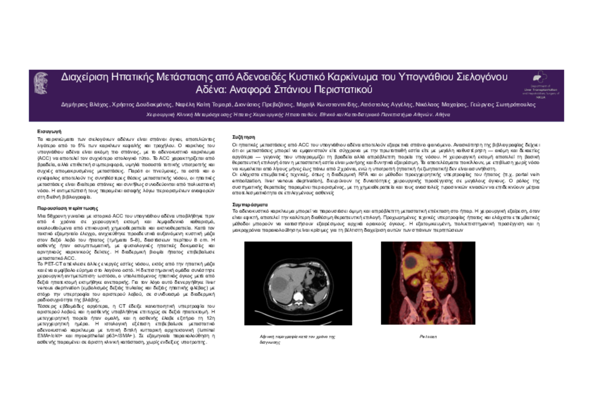 Το αδενοκυστικό καρκίνωμα μπορεί να παρουσιάσει όψιμη και απρόβλεπτη μεταστατική επέκταση στο ήπαρ. Η χειρουργική εξαίρεση, όταν είναι εφικτή, αποτελεί την καλύτερη διαθέσιμη θεραπευτική επιλογή. Προχωρημένες τεχνικές υπερτροφίας ήπατος και ελάχιστα επεμβατικές μέθοδοι μπορούν να καταστήσουν εξαιρέσιμους αρχικά οριακούς όγκους. Η εξατομικευμένη, πολυεπιστημονική προσέγγιση και η μακροχρόνια παρακολούθηση είναι κρίσιμες για τη βέλτιστη διαχείριση αυτών των σπάνιων περιπτώσεων.