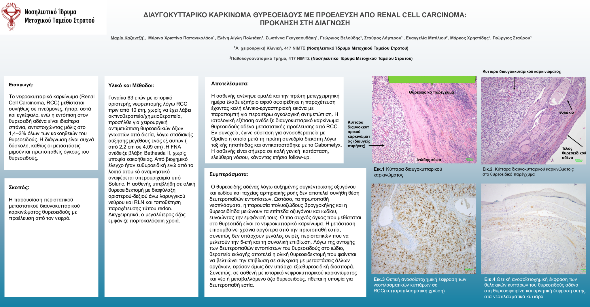 Αποτελέσματα:Η ασθενής ανένηψε ομαλά και την πρώτη μετεγχειρητική ημέρα έλαβε εξιτήριο αφού αφαιρέθηκε η παροχέτευση έχοντας καλή κλινικο-εργαστηριακή εικόνα με παραπομπή για περαιτέρω ογκολογική αντιμετώπιση. Η ιστολογική εξέταση ανέδειξε διαυγοκυτταρικό καρκίνωμα θυρεοειδούς αδένα μεταστατικής προέλευσης από RCC. Εν συνεχεία, έγινε σύσταση για ανοσοθεραπεία με Opdivo η οποία μετά τη πρώτη συνεδρία διεκόπη λόγω τοξικής ηπατίτιδας και αντικαταστάθηκε με το Cabometyx. Η ασθενής είναι σήμερα σε καλή γενική κατάσταση, ελεύθερη νόσου, κάνοντας ετήσια follow-up.