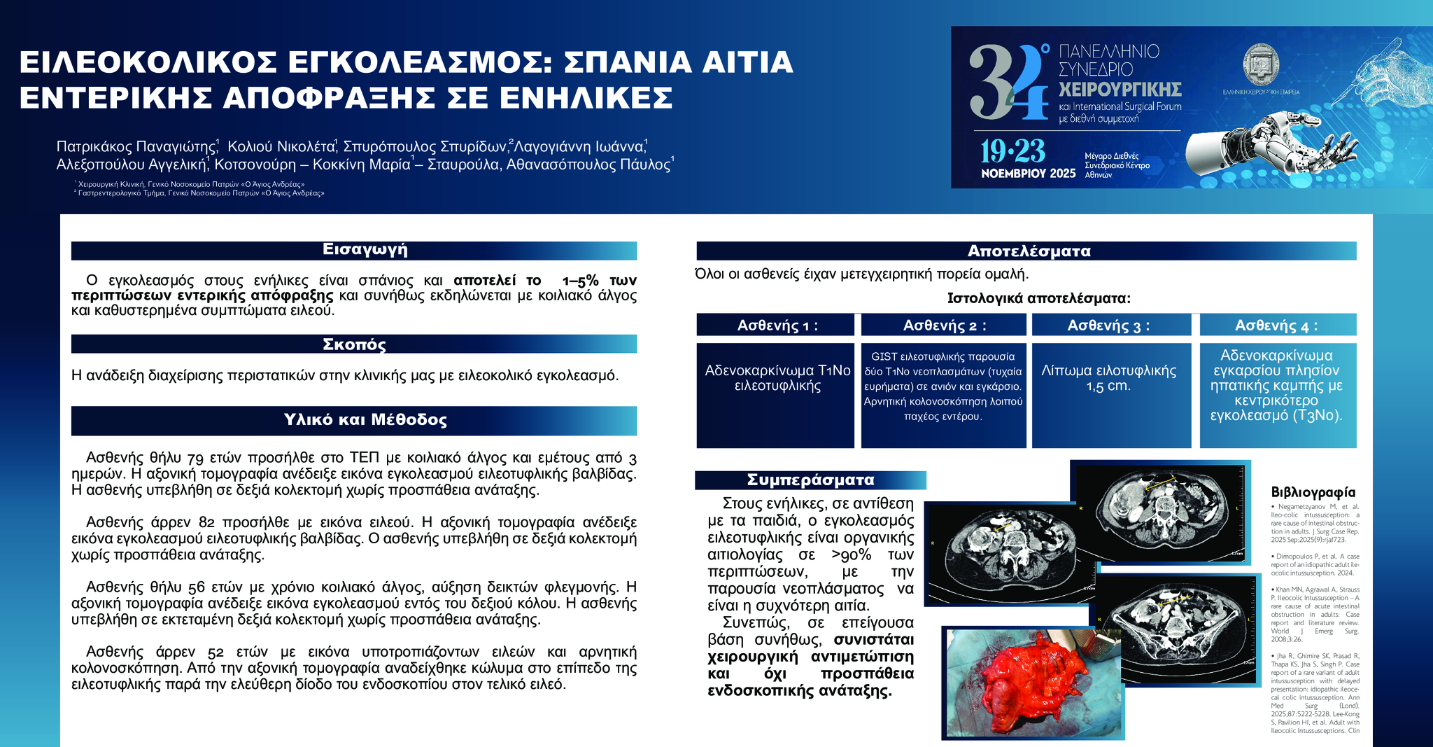 Ασθενής θήλυ 79 ετών προσήλθε στο ΤΕΠ με κοιλιακό άλγος και εμέτους από 3 ημερών. Η αξονική τομογραφία ανέδειξε εικόνα εγκολεασμού ειλεοτυφλικής βαλβίδας. Η ασθενής υπεβλήθη σε δεξιά κολεκτομή χωρίς προσπάθεια ανάταξης.