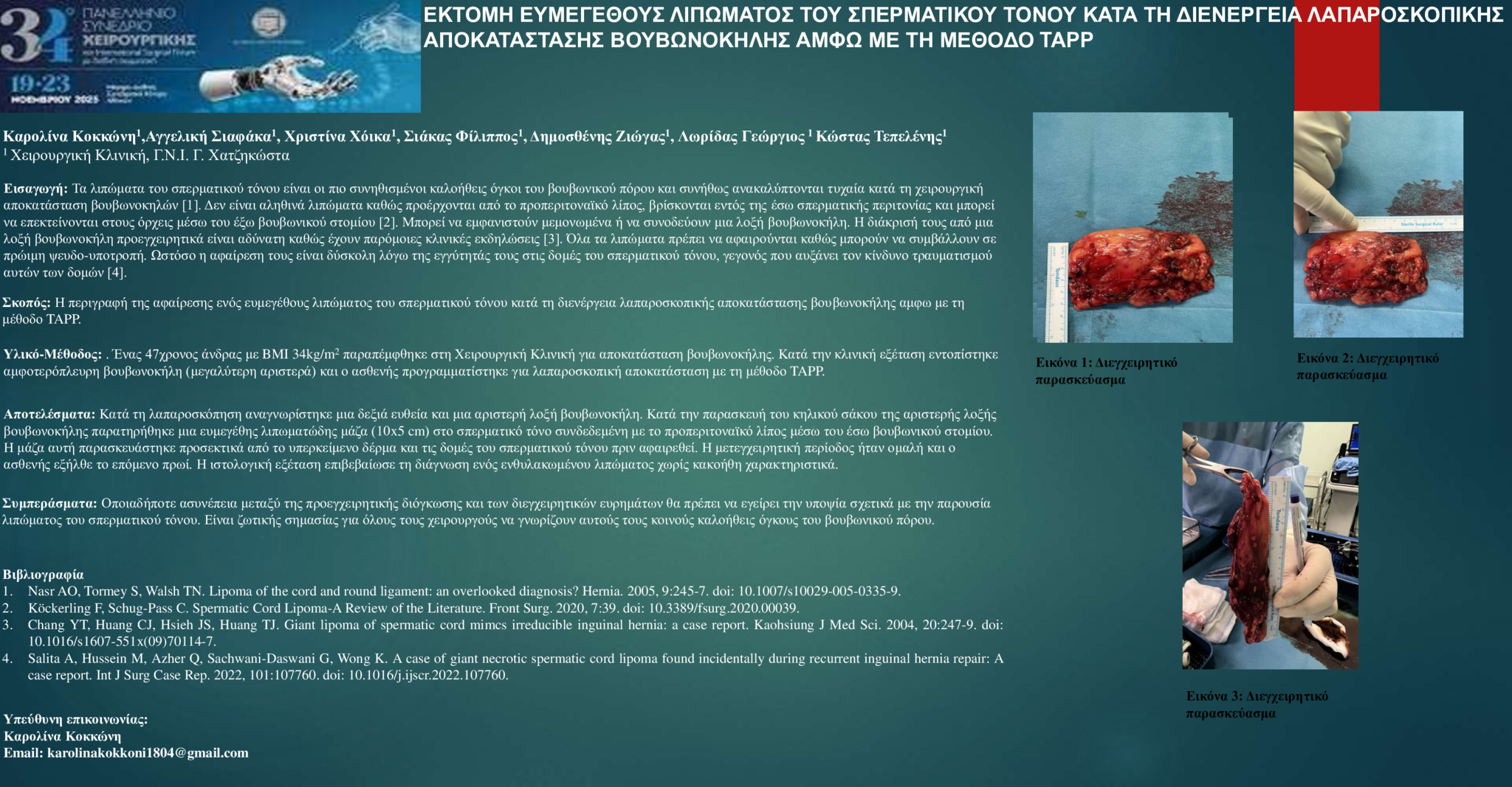 Εισαγωγή: Τα λιπώματα του σπερματικού τόνου είναι οι πιο συνηθισμένοι καλοήθεις όγκοι του βουβωνικού πόρου και συνήθως ανακαλύπτονται τυχαία κατά τη χειρουργική αποκατάσταση βουβωνοκηλών [1]. Δεν είναι αληθινά λιπώματα καθώς προέρχονται από το προπεριτοναϊκό λίπος, βρίσκονται εντός της έσω σπερματικής περιτονίας και μπορεί να επεκτείνονται στους όρχεις μέσω του έξω βουβωνικού στομίου [2]. Μπορεί να εμφανιστούν μεμονωμένα ή να συνοδεύουν μια λοξή βουβωνοκήλη. Η διάκρισή τους από μια λοξή βουβωνοκήλη προεγχειρητικά είναι αδύνατη καθώς έχουν παρόμοιες κλινικές εκδηλώσεις [3]. Όλα τα λιπώματα πρέπει να αφαιρούνται καθώς μπορούν να συμβάλλουν σε πρώιμη ψευδο-υποτροπή. Ωστόσο η αφαίρεση τους είναι δύσκολη λόγω της εγγύτητάς τους στις δομές του σπερματικού τόνου, γεγονός που αυξάνει τον κίνδυνο τραυματισμού αυτών των δομών [4].