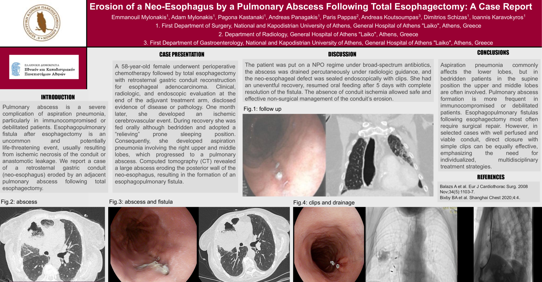Aspiration pneumonia commonly affects the lower lobes, but in bedridden patients in the supine position the upper and middle lobes are often involved. Pulmonary abscess formation is more frequent in immunocompromised or debilitated patients. Esophagopulmonary fistulas following esophagectomy most often require surgical repair. However, in selected cases with well perfused and viable conduit, direct closure with simple clips can be equally effective, emphasizing the need for individualized, multidisciplinary treatment strategies.