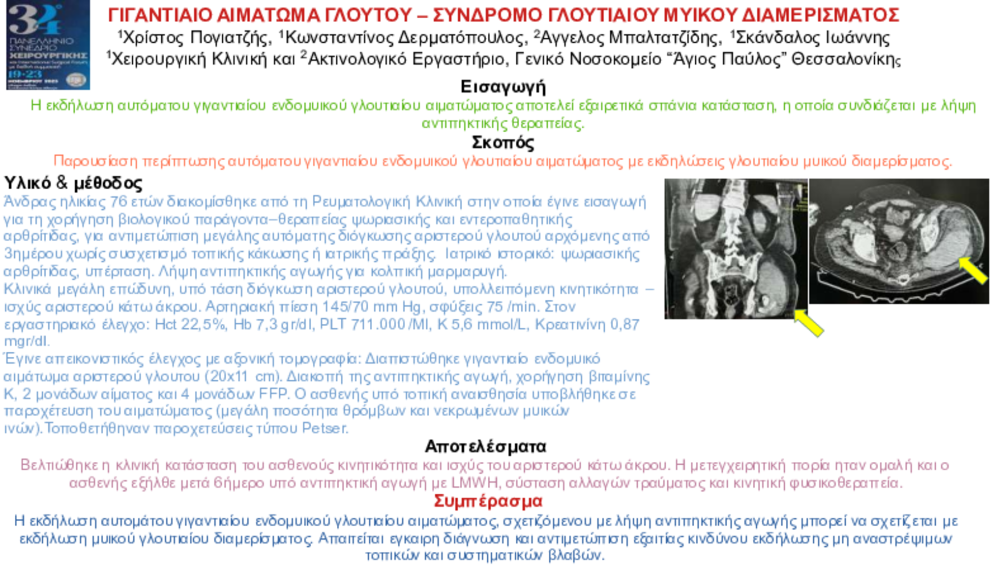 Παρουσίαση περίπτωσης αυτόματου γιγαντιαίου ενδομυικού γλουτιαίου αιματώματος με εκδηλώσεις γλουτιαίου μυικού διαμερίσματος.