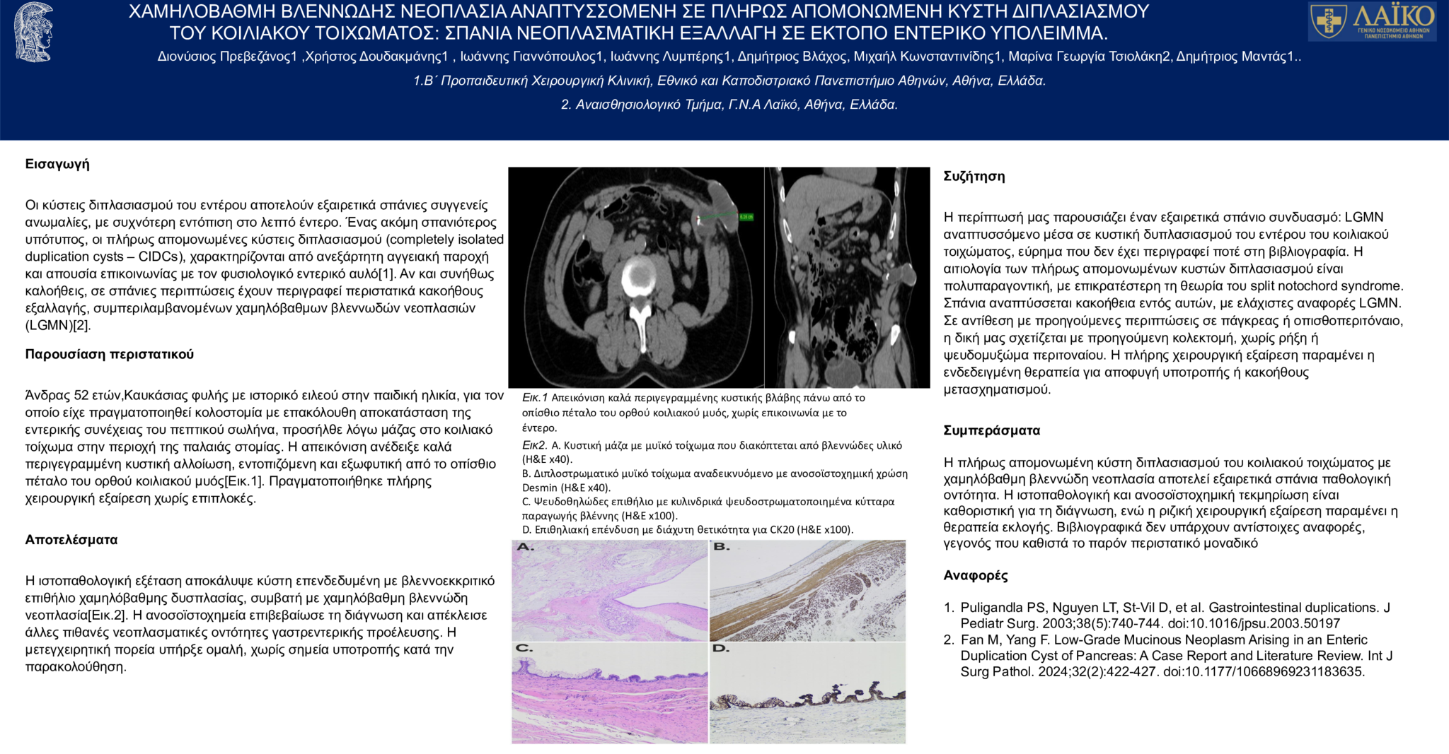 ΧΑΜΗΛΟΒΑΘΜΗ ΒΛΕΝΝΩΔΗΣ ΝΕΟΠΛΑΣΙΑ ΑΝΑΠΤΥΣΣΟΜΕΝΗ ΣΕ ΠΛΗΡΩΣ ΑΠΟΜΟΝΩΜΕΝΗ ΚΥΣΤΗ ΔΙΠΛΑΣΙΑΣΜΟΥ ΤΟΥ ΚΟΙΛΙΑΚΟΥ ΤΟΙΧΩΜΑΤΟΣ: ΣΠΑΝΙΑ ΝΕΟΠΛΑΣΜΑΤΙΚΗ ΕΞΑΛΛΑΓΗ ΣΕ ΕΚΤΟΠΟ ΕΝΤΕΡΙΚΟ ΥΠΟΛΕΙΜΜΑ.