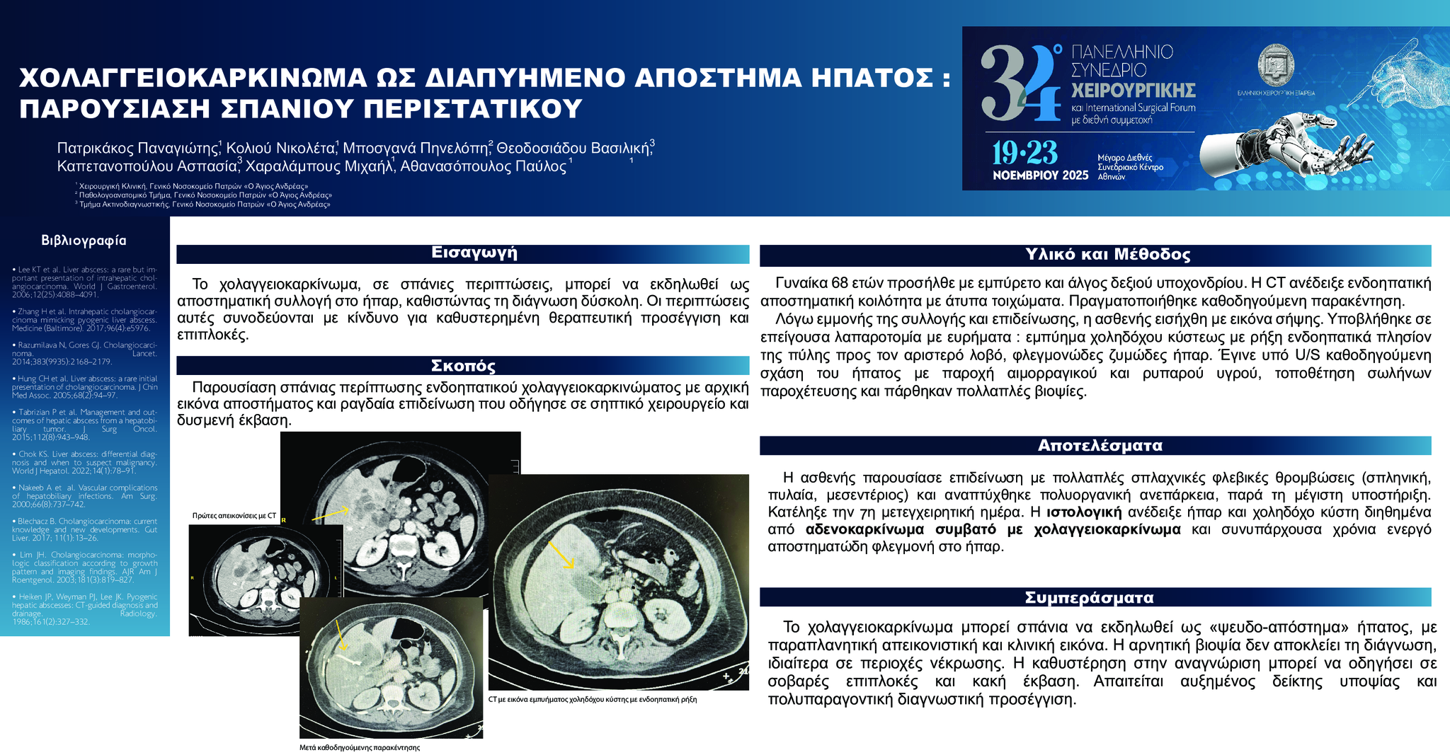 Το χολαγγειοκαρκίνωμα μπορεί σπάνια να εκδηλωθεί ως «ψευδο-απόστημα» ήπατος, με παραπλανητική απεικονιστική και κλινική εικόνα. Η αρνητική βιοψία δεν αποκλείει τη διάγνωση, ιδιαίτερα σε περιοχές νέκρωσης. Η καθυστέρηση στην αναγνώριση μπορεί να οδηγήσει σε σοβαρές επιπλοκές και κακή έκβαση. Απαιτείται αυξημένος δείκτης υποψίας και πολυπαραγοντική διαγνωστική προσέγγιση.