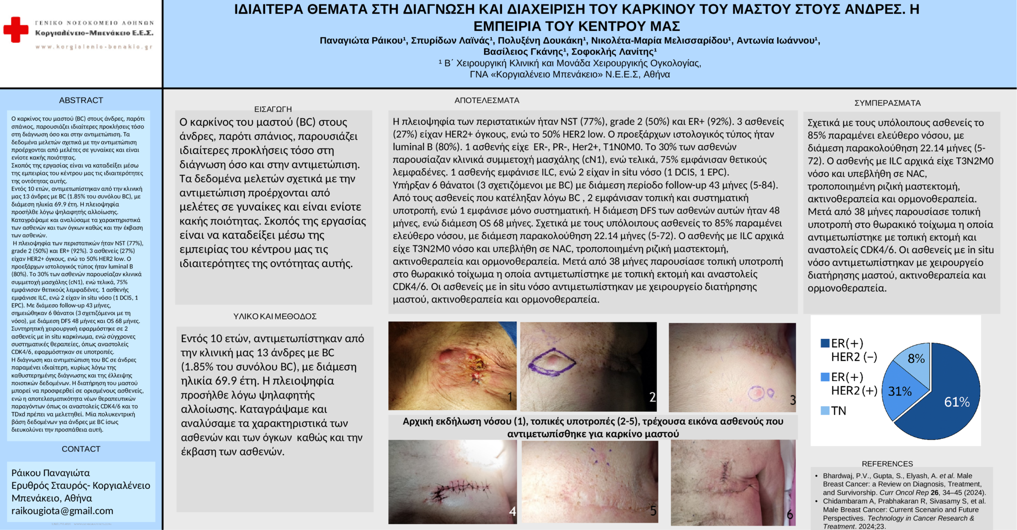 Συμπεράσματα: Η διάγνωση και αντιμετώπιση του BC σε άνδρες παραμένει ιδιαίτερη, κυρίως λόγω της καθυστερημένης διάγνωσης και της έλλειψης ποιοτικών δεδομένων. Η διατήρηση του μαστού μπορεί να προσφερθεί σε ορισμένους ασθενείς, ενώ η αποτελεσματικότητα νέων θεραπευτικών παραγόντων όπως οι αναστολείς CDK4/6 και το TDxd πρέπει να μελετηθεί. Μία πολυκεντρική βάση δεδομένων για άνδρες με BC ίσως διευκολύνει την προσπάθεια αυτή.