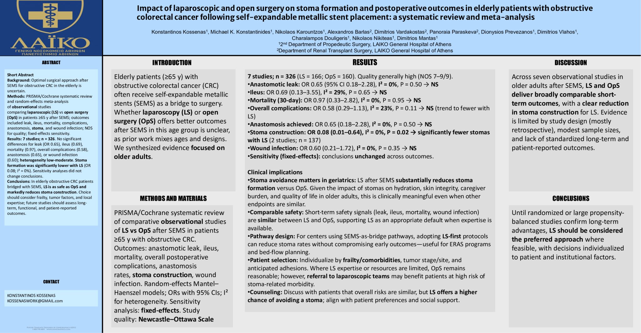 IMPACT OF LAPAROSCOPIC AND OPEN SURGERY ON STOMA FORMATION AND POSTOPERATIVE OUTCOMES IN ELDERLY PATIENTS WITH OBSTRUCTIVE COLORECTAL CANCER FOLLOWING SELF-EXPANDABLE METALLIC STENT PLACEMENT: A SYSTEMATIC REVIEW AND META-ANALYSIS