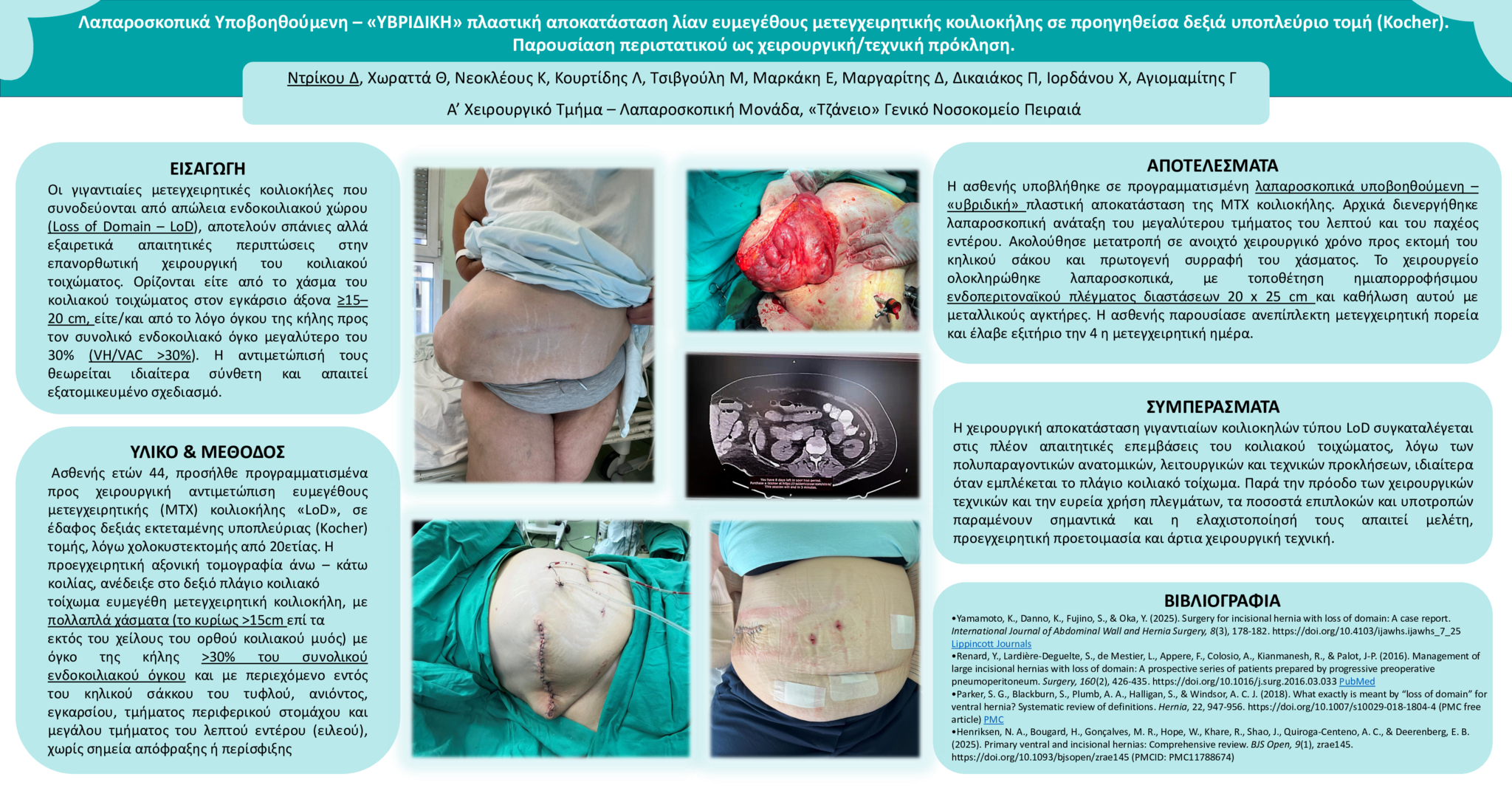 ΣΥΜΠΕΡΑΣΜΑΤΑ: Η αποκατάσταση γιγαντιαίων κοιλιοκηλών τύπου LoD είναι από τις πιο απαιτητικές επεμβάσεις του κοιλιακού τοιχώματος, λόγω σύνθετων ανατομικών και τεχνικών δυσκολιών, ειδικά όταν εμπλέκεται το πλάγιο τοίχωμα. Παρά την πρόοδο, οι επιπλοκές και οι υποτροπές παραμένουν συχνές, απαιτώντας σωστή προετοιμασία και άρτια τεχνική.