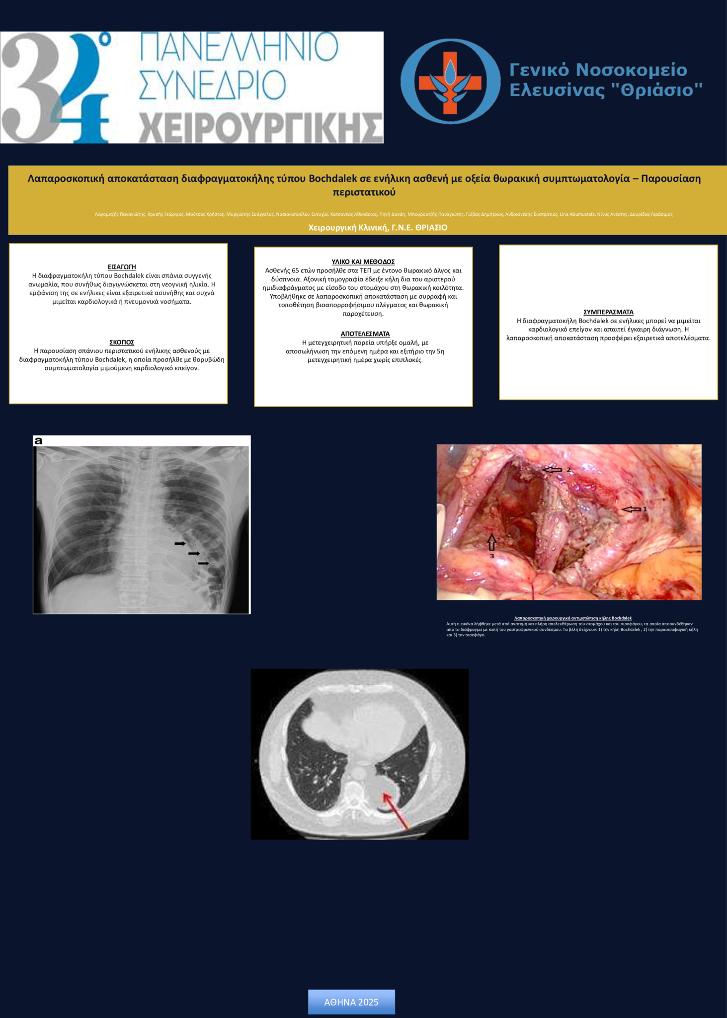 Εισαγωγή Η διαφραγματοκήλη τύπου Bochdalek είναι σπάνια συγγενής ανωμαλία, που συνήθως διαγιγνώσκεται στη νεογνική ηλικία. Η εμφάνισή της σε ενήλικες είναι εξαιρετικά ασυνήθης και συχνά μιμείται καρδιολογικά ή πνευμονικά νοσήματα, καθιστώντας τη διάγνωση απαιτητική. Η λαπαροσκοπική αποκατάσταση έχει επικρατήσει ως ασφαλής και αποτελεσματική θεραπευτική επιλογή. Σκοπός Η παρουσίαση σπάνιου περιστατικού ενήλικης ασθενούς με διαφραγματοκήλη τύπου Bochdalek, η οποία προσήλθε με οξεία, θορυβώδη κλινική εικόνα μιμούμενη καρδιολογικό επείγον. Υλικό και Μέθοδος Ασθενής 65 ετών προσήλθε στα ΤΕΠ με έντονο θωρακικό άλγος αριστερά και δύσπνοια. Αρχικά εκτιμήθηκε από το Καρδιολογικό ΤΕΠ λόγω ύποπτου οξέος στεφανιαίου συνδρόμου. Ο απεικονιστικός έλεγχος (CT) αποκάλυψε ευμεγέθη κήλη δια του αριστερού ημιδιαφράγματος με είσοδο του στομάχου στην θωρακική κοιλότητα. Υποβλήθηκε σε λαπαροσκοπική αποκατάσταση της κήλης Bochdalek, με συρραφή του ελλείμματος του διαφράγματος και τοποθέτηση βιοαπορροφήσιμου πλέγματος, καθώς και θωρακική παροχέτευση αριστερά. Αποτελέσματα Η μετεγχειρητική πορεία υπήρξε ομαλή. Η ασθενής αποσωληνώθηκε την επομένη και μεταφέρθηκε από τη ΜΕΘ στην κλινική σε σταθερή κατάσταση. Έλαβε εξιτήριο την 5η μετεγχειρητική ημέρα σε καλή γενική κατάσταση, χωρίς επιπλοκές. Συμπεράσματα Η διαφραγματοκήλη τύπου Bochdalek σε ενήλικες μπορεί να εκδηλωθεί με έντονη καρδιοαναπνευστική συμπτωματολογία, μιμούμενη οξύ καρδιολογικό επεισόδιο. Η έγκαιρη διάγνωση με απεικονιστικό έλεγχο και η λαπαροσκοπική αποκατάσταση προσφέρουν άριστα αποτελέσματα με ελάχιστη νοσηρότητα
