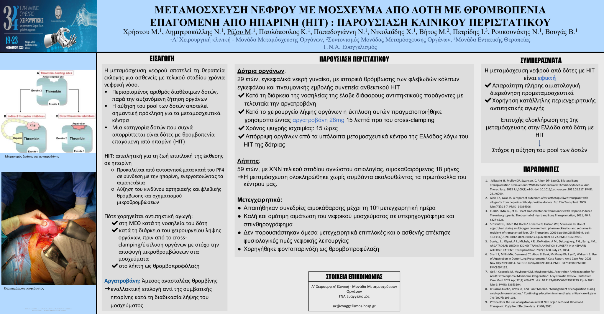 Συμπέρασμα: Το περιστατικό αυτό υπογραμμίζει ότι η διενέργεια μεταμόσχευσης νεφρού από δότες με HIT είναι εφικτή, υπό την προϋπόθεση πλήρους αιματολογικής διερεύνησης προμεταμοσχευτικά και περιεγχειρητικά και χορήγησης κατάλληλης περιεγχειρητικής αντιπηκτικής αγωγής. Η χρήση αργατροβάνης ως αντιπηκτικό κατά την προετοιμασία του μοσχεύματος σε περιπτώσεις όπου η ηπαρίνη δεν ενδείκνυται, αποτελεί επιλογή που απαιτεί περαιτέρω διερεύνηση ωστε δότες με ανθεκτικό ΗΙΤ να μπορούν να προχωρήσουν σε επιτυχή δωρεά οργάνων.