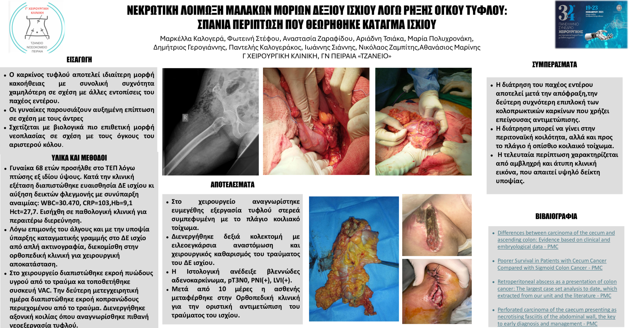 Αποτελέσματα: Στο χειρουργείο αναγνωρίσθηκε ευμεγέθης εξεργασία τυφλού στερεά συμπεφυμένη με το πλάγιο κοιλιακό τοίχωμα. Διενεργήθηκε δεξιά κολεκτομή με ειλεοεγκάρσια αναστόμωση και χειρουργικός καθαρισμός του τραύματος του ΔΕ ισχίου. Η Ιστολογική ανέδειξε βλεννώδες αδενοκαρκίνωμα, pΤ3Ν0, PNI(+), LVI(+). Μετά από 10 μέρες η ασθενής μεταφέρθηκε στην Ορθοπεδική κλινική για την οριστική αντιμετώπιση του τραύματος του ΔΕ ισχίου.