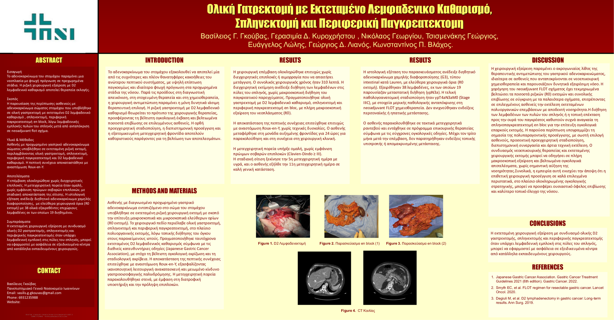 Η παρουσίαση της περίπτωσης ασθενούς με αδενοκαρκίνωμα σώματος στομάχου που υποβλήθηκε σε ολική γαστρεκτομή με εκτεταμένο D2 λεμφαδενικό καθαρισμό , σπληνεκτομή, περιφερική παγκρεατεκτομή en block, λόγω λεμφαδενικής εμπλοκής πυλών του σπληνός μετά από ανταπόκριση σε neoadjuvant flot σχήμα.