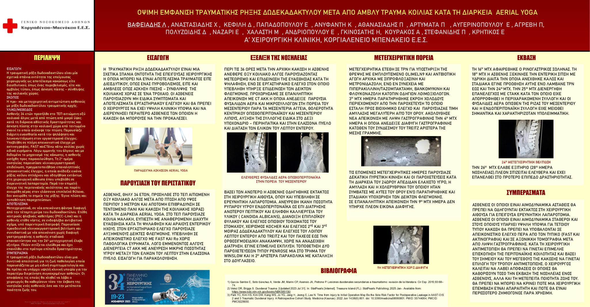 Ασθενής 34 ετών προσήλθε στο ΤΕΠ αιτιώμενη οξύ κοιλιακό άλγος μετά από πτώση από μικρό ύψος κατά τη διάρκεια αθλητικής δραστηριότητας και άσκηση πίεσης στην κοιλιακή χώρα από τεντωμένο σκοινί το οποίο ανέκοψε την πτώση. Παρουσίαζε διάχυτη ευαισθησία κατά την ψηλάφηση και λευκοκυττάρωση στον εργαστηριακό έλεγχος. Υπεβλήθη σε πλήρη απεικονιστικό έλεγχο με ακτινογραφίες, FAST και CT άνω κάτω κοιλίας χωρίς ειδικά ευρήματα. Λόγω εμμονής του άλγους και με δεδομένο το μηχανισμό της κάκωσης, η ασθενής εισήχθη προς παρακολούθηση. Τη 2η ημέρα νοσηλείας παρουσίασε κλινικοεργαστηριακή επιδείνωση, πραγματοποιήθηκε επαναληπτικός απεικονιστικός έλεγχος, η οποία ανέδειξε εικόνα ρήξης κοίλου σπλάχνου και οδηγήθηκε εκτάκτως στη χειρουργική αίθουσα όπου υπεβλήθη σε διερευνητική λαπαροτομία. Παρά την επιμελή έλεγχο της περιτοναϊκής κοιλότητας και παρότι ανευρέθη αέρας στον ελάσσονα επιπλοϊκό θύλακο, δεν ανευρέθη το σημείο της ρήξης. Έγινε πλύση και τοποθέτηση παροχετεύσεων.