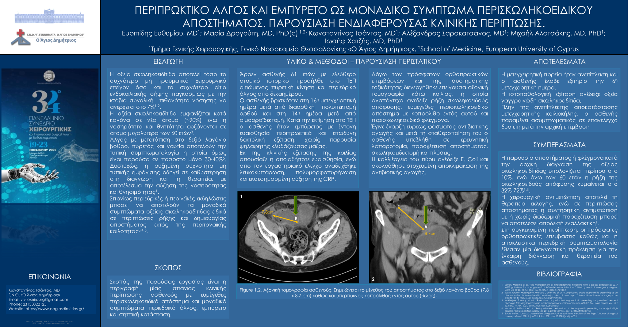 Άρρεν ασθενής 61 ετών με ελεύθερο ατομικό ιστορικό προσήλθε στο ΤΕΠ αιτιώμενος πυρετική κίνηση και περιεδρικό άλγος από δεκαημέρου. Ο ασθενής βρισκόταν στη 16η μετεγχειρητική ημέρα μετά από πολυπεκτομή ορθού και στη 14η ημέρα μετά από αιμορροϊδεκτομή. Κατά την εκτίμηση στο ΤΕΠ ο ασθενής ήταν εμπύρετος με έντονη παραεδρική ευαισθησία και επώδυνη δακτυλική εξέταση, χωρίς παρουσία ψηλαφητής κλυδάζουσας μάζας. Εκ της κλινικής εξέτασης της κοιλίας απουσίαζε η οποιαδήποτε ευαισθησία, ενώ από τον εργαστηριακό έλεγχο αναδείχθηκε λευκοκυττάρωση και εκσεσημασμένη αύξηση της CRP. Λόγω των πρόσφατων ορθοπρωκτικών επεμβάσεων και της συστηματικής τοξικότητας διενεργήθηκε επείγουσα αξονική τομογραφία κάτω κοιλίας, η οποία αναπάντεχα ανέδειξε ευμέγεθες περισκωληκοειδικό απόστημα. Ο ασθενής υπεβλήθη σε ερευνητική λαπαροτομία, παροχέτευση αποστήματος και σκωληκοειδεκτομή.