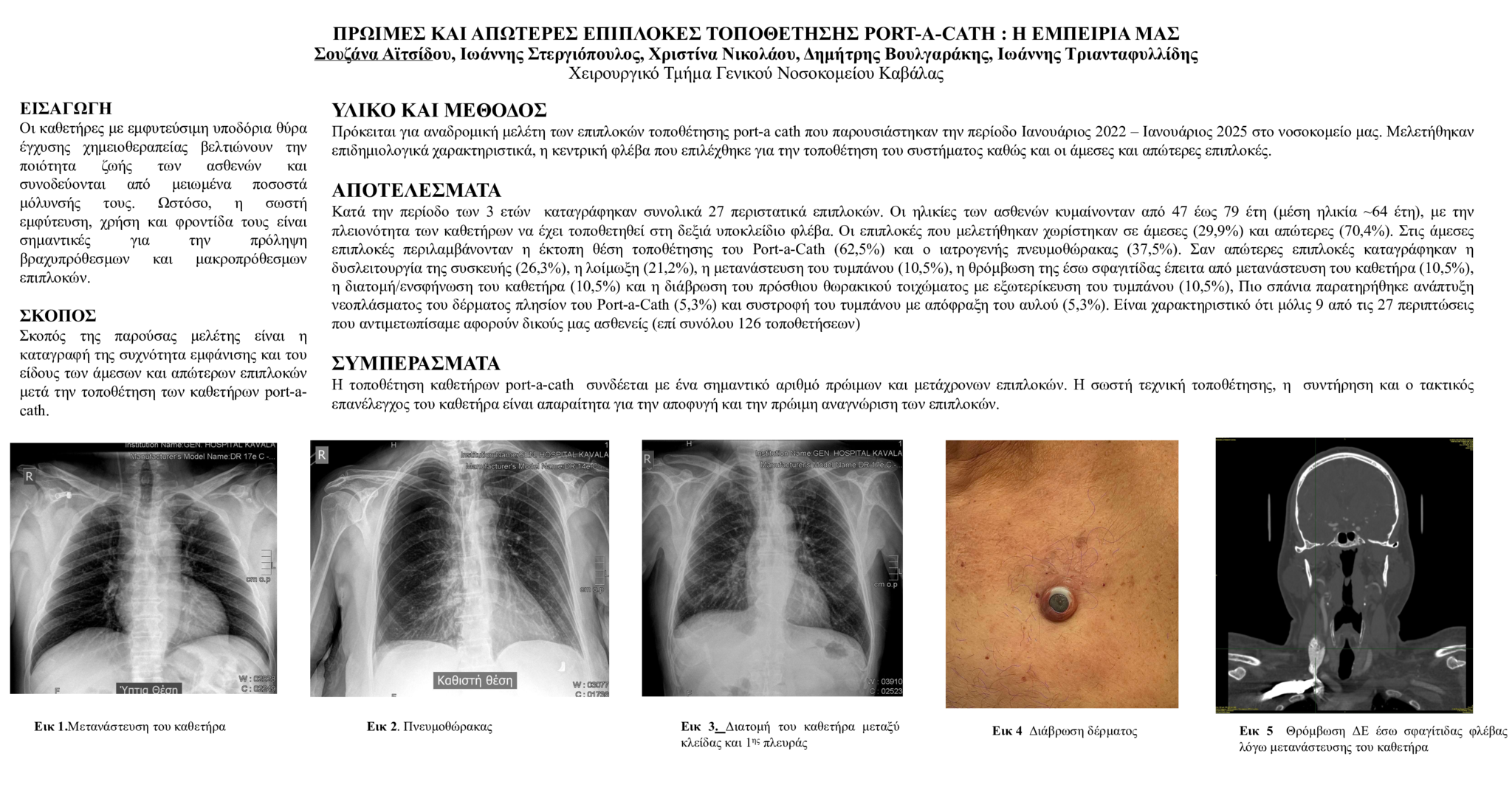 Πρόκειται για αναδρομική μελέτη των επιπλοκών τοποθέτησης port-a cath που παρουσιάστηκαν την περίοδο Ιανουάριος 2022 – Ιανουάριος 2025 στο νοσοκομείο μας. Μελετήθηκαν επιδημιολογικά χαρακτηριστικά, η κεντρική φλέβα που επιλέχθηκε για την τοποθέτηση του συστήματος καθώς και οι άμεσες και απώτερες επιπλοκές.