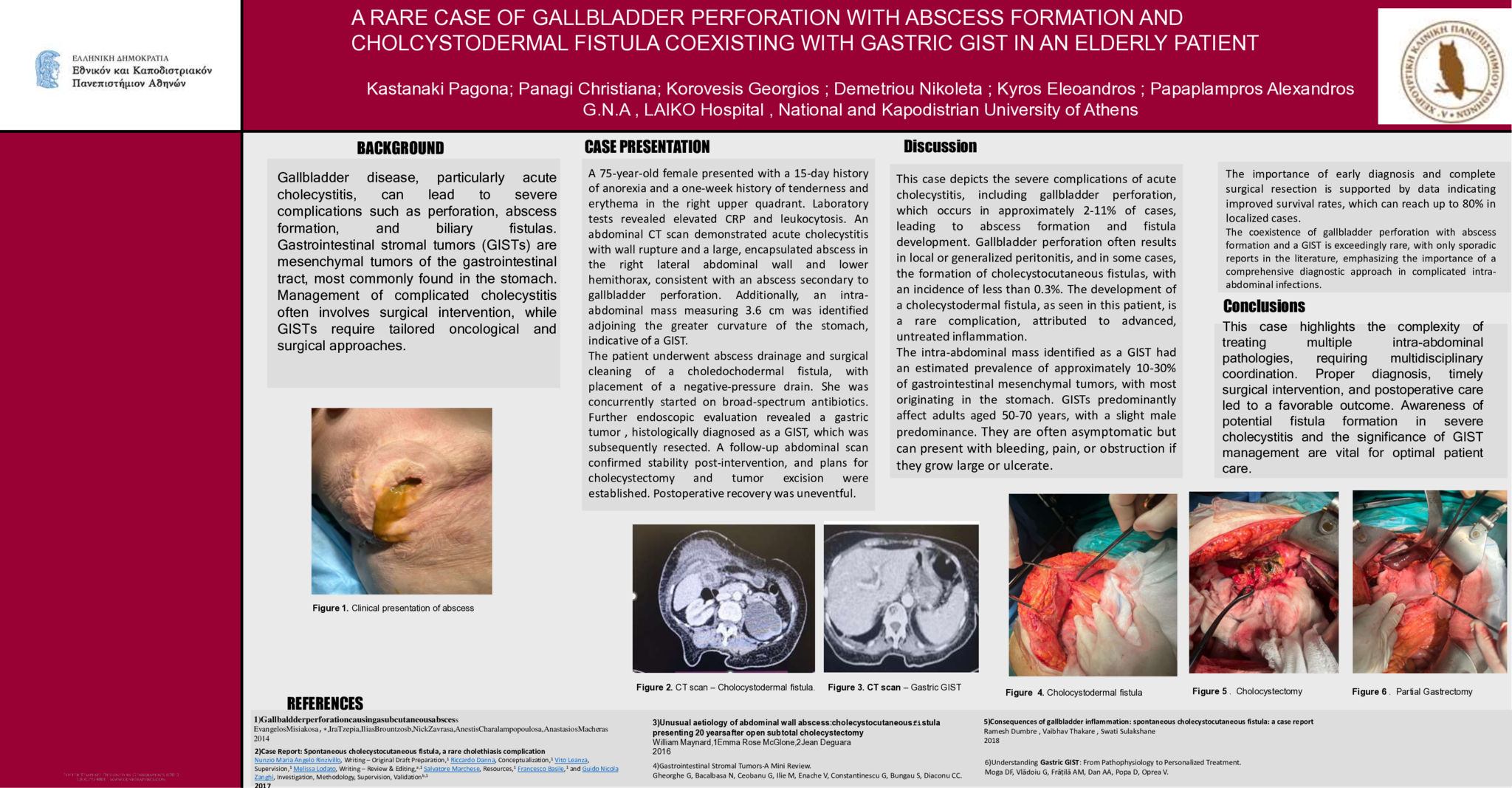 This case highlights the complexity of treating multiple intra-abdominal pathologies, requiring multidisciplinary coordination. Proper diagnosis, timely surgical intervention, and postoperative care led to a favorable outcome. Awareness of potential fistula formation in severe cholecystitis and the significance of GIST management are vital for optimal patient care.