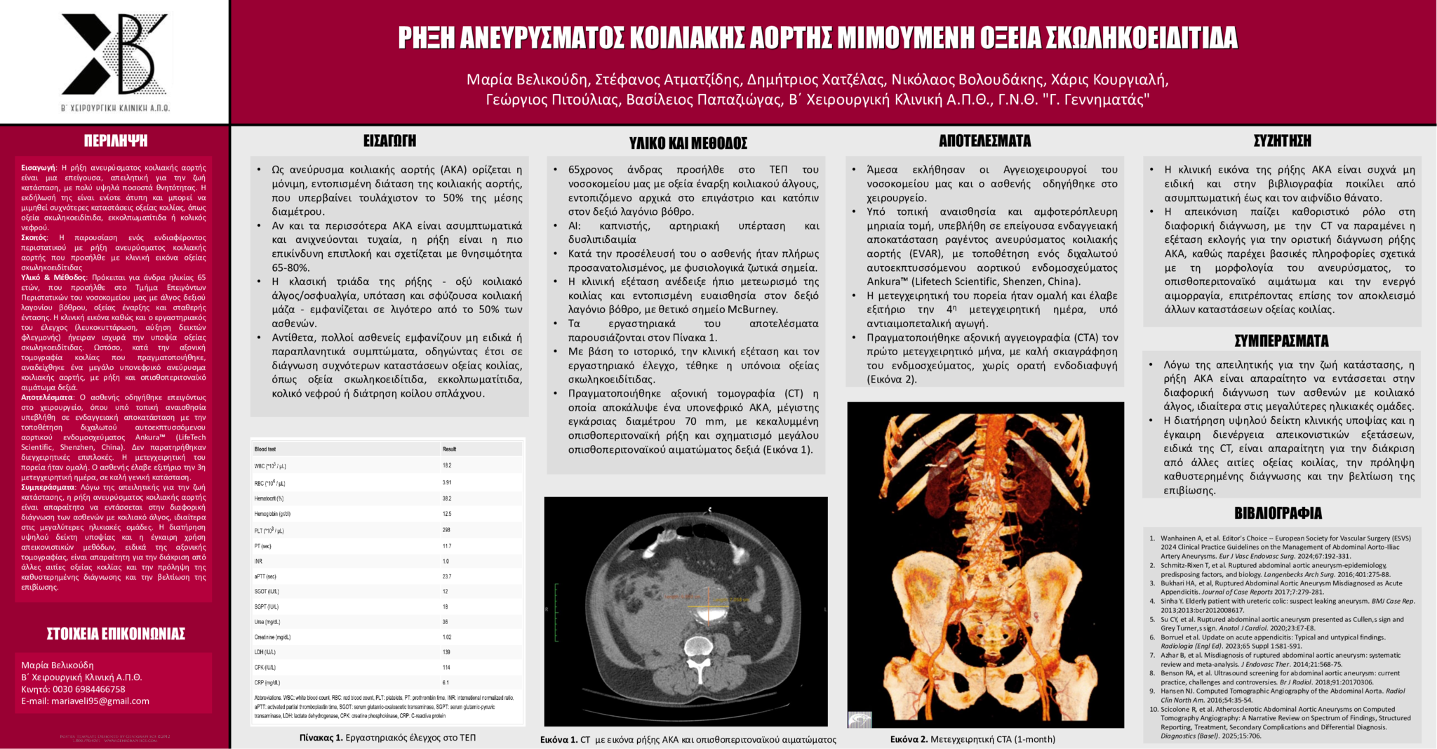 Εισαγωγή: Η ρήξη ανευρύσματος κοιλιακής αορτής είναι μια επείγουσα, απειλητική για την ζωή κατάσταση, με πολύ υψηλά ποσοστά θνητότητας. Η εκδήλωσή της είναι ενίοτε άτυπη και μπορεί να μιμηθεί συχνότερες καταστάσεις οξείας κοιλίας, όπως οξεία σκωληκοειδίτιδα, εκκολπωματίτιδα ή κολικός νεφρού.