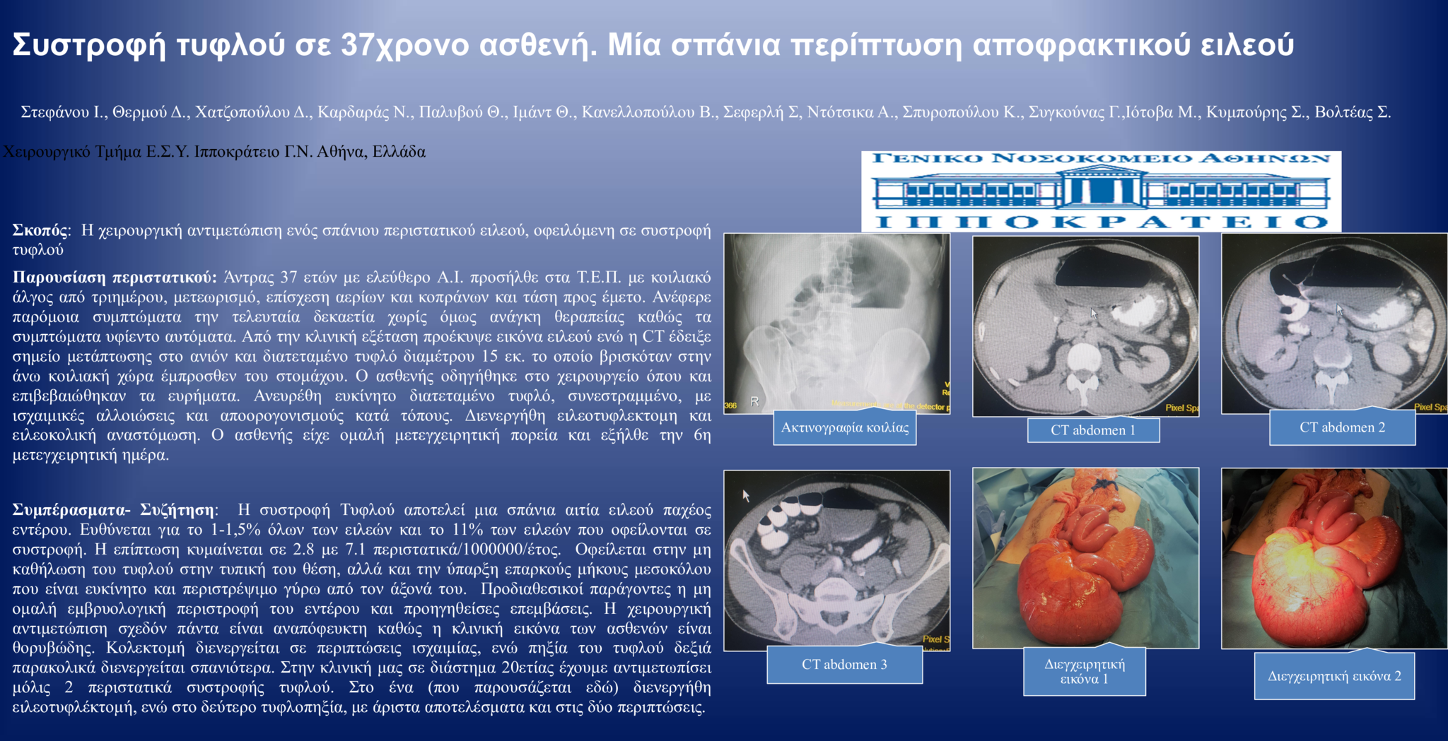 Άντρας 37 ετών με ελεύθερο Α.Ι. προσήλθε στα ΤΕΠ με κοιλιακό άλγος από τριημέρου, επίσχεση αερίων και κοπράνων και τάση προς έμετο. Από την κλινική εξέταση προέκυψε εικόνα ειλεού ενώ η CT έδειξε σημείο μετάπτωσης στο ανιόν και διατεταμένο τυφλό διαμέτρου 15 εκ. εντοπιζόμενο στην άνω κοιλιακή χώρα έμπροσθεν του στομάχου. Ο ασθενής οδηγήθηκε στο χειρουργείο όπου ανευρέθη ευκίνητο διατεταμένο τυφλό, συνεστραμμένο, με ισχαιμικές αλλοιώσεις και αποορογονισμούς κατά τόπους. Διενεργήθη ειλεοτυφλεκτομη και ειλεοκολική αναστόμωση. Ο ασθενής είχε ομαλή πορεία και εξήλθε την 6η μετεγχειρητική ημέρα.