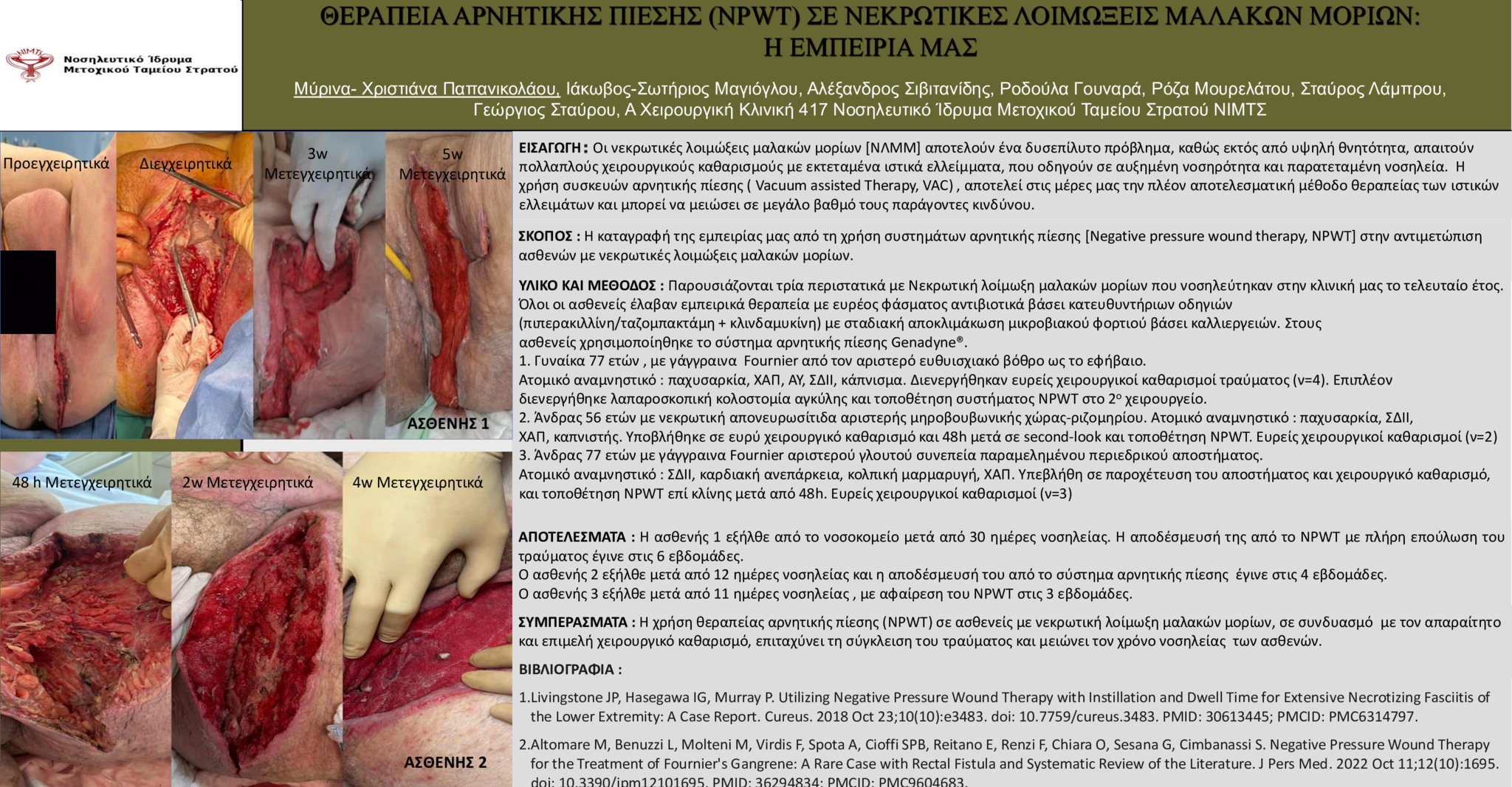 Συμπεράσματα : Η χρήση θεραπείας αρνητικής πίεσης (NPWT) σε ασθενείς με νεκρωτική λοίμωξη μαλακών μορίων, σε συνδυασμό με τον απαραίτητο και επιμελή χειρουργικό καθαρισμό, επιταχύνει τη σύγκλειση του τραύματος και μειώνει τον χρόνο νοσηλείας των ασθενών.