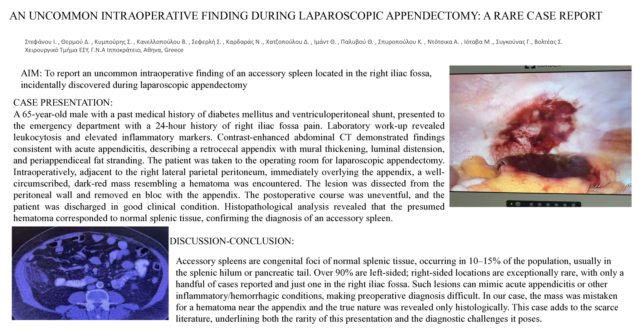 A 65-year-old male with a past medical history of diabetes mellitus and ventriculoperitoneal shunt, presented to the emergency department with a 24-hour history of right iliac fossa pain. Laboratory work-up revealed leukocytosis and elevated inflammatory markers. Contrast-enhanced abdominal CT demonstrated findings consistent with acute appendicitis, describing a retrocecal appendix with mural thickening, luminal distension, and periappendiceal fat stranding. The patient was taken to the operating room for laparoscopic appendectomy. Intraoperatively, adjacent to the right lateral parietal peritoneum, immediately overlying the appendix, a well-circumscribed, dark-red mass resembling a hematoma was encountered. The lesion was dissected from the peritoneal wall and removed en bloc with the appendix. The postoperative course was uneventful, and the patient was discharged in good clinical condition. Histopathological analysis revealed that the presumed hematoma corresponded to normal splenic tissue, confirming the diagnosis of an accessory spleen.