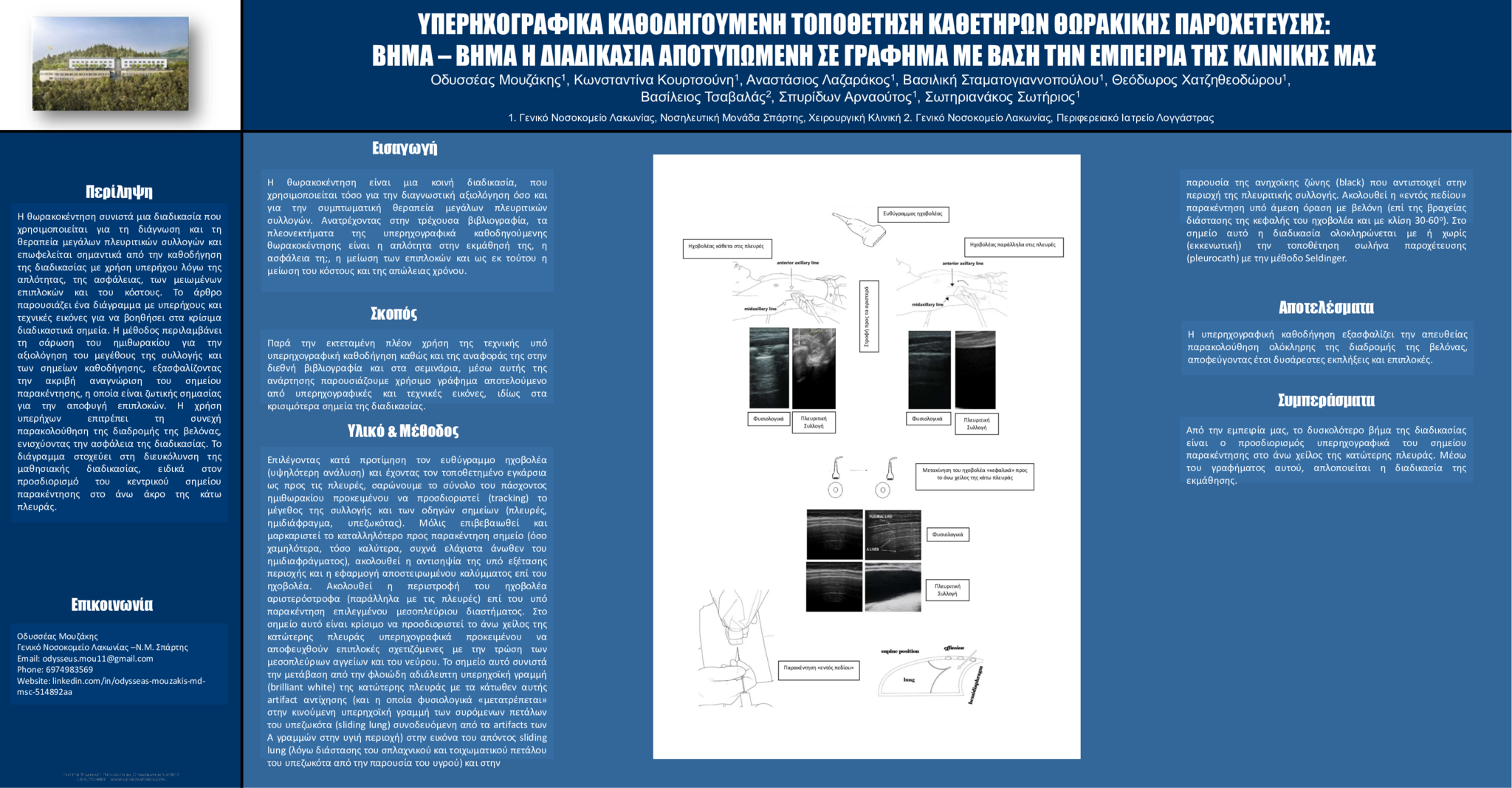 Η θωρακοκέντηση είναι μια κοινή διαδικασία, που χρησιμοποιείται τόσο για την διαγνωστική αξιολόγηση όσο και για την συμπτωματική θεραπεία μεγάλων πλευριτικών συλλογών. Ανατρέχοντας στην τρέχουσα βιβλιογραφία, τα πλεονεκτήματα της υπερηχογραφικά καθοδηγούμενης θωρακοκέντησης είναι η απλότητα στην εκμάθησή της, η ασφάλεια, η μείωση των επιπλοκών και ως εκ τούτου η μείωση του κόστους και της απώλειας χρόνου.