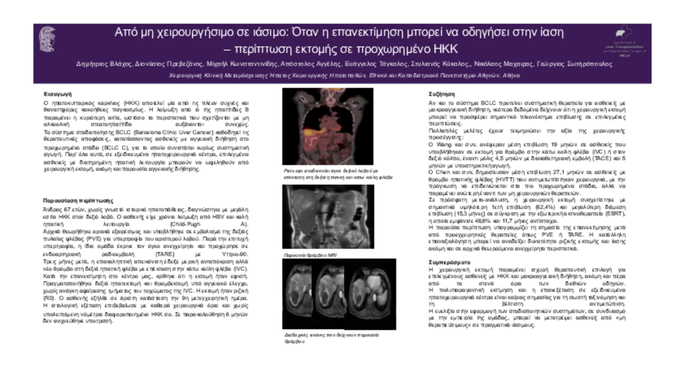 Βλαχος Δημητριος «Από μη χειρουργήσιμο σε ιάσιμο: Όταν η επανεκτίμηση μπορεί να οδηγήσει στην ίαση – περίπτωση εκτομής σε προχωρημένο ΗΚΚ» / Χειρουργική παθήσεων Ήπατος-Παγκρέατος -Χοληφόρων