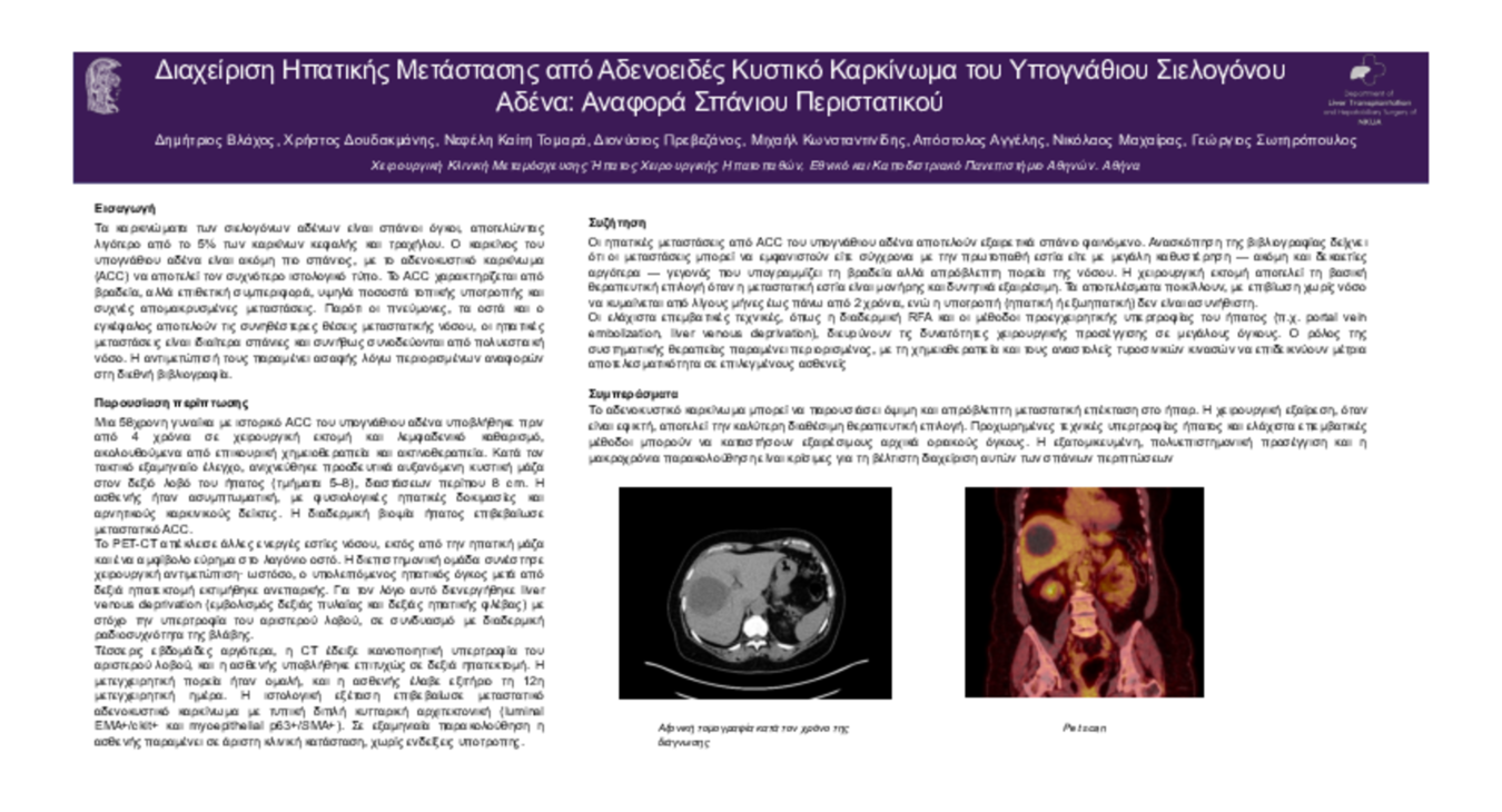 Βλαχος Δημητριος Διαχείριση Ηπατικής Μετάστασης από Αδενοειδές Κυστικό Καρκίνωμα του Υπογνάθιου Σιελογόνου Αδένα: Αναφορά Σπάνιου Περιστατικού / Χειρουργική παθήσεων Ήπατος-Παγκρέατος -Χοληφόρων