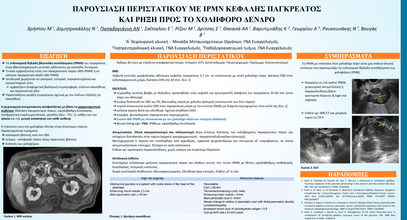 Χρήστου Μαρία ΠΑΡΟΥΣΙΑΣΗ ΠΕΡΙΣΤΑΤΙΚΟΥ ΑΣΘΕΝΟΥΣ ΜΕ IPMN ΚΕΦΑΛΗΣ ΠΑΓΚΡΕΑΤΟΣ ΚΑΙ ΡΗΞΗ ΠΡΟΣ ΤΟ ΧΟΛΗΦΟΡΟ ΔΕΝΔΡΟ / Χειρουργική παθήσεων Ήπατος-Παγκρέατος -Χοληφόρων