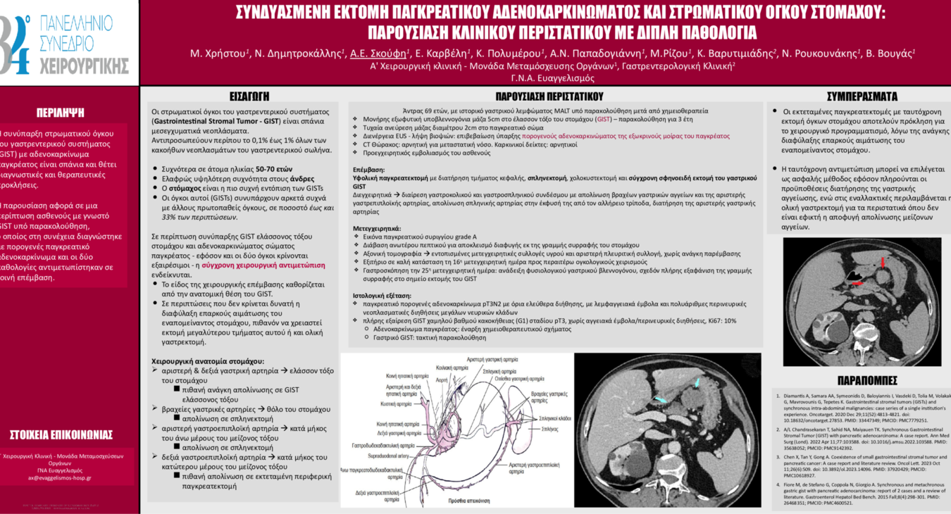 Χρήστου Μαρία ΣΥΝΔΥΑΣΜΕΝΗ ΕΚΤΟΜΗ ΠΑΓΚΡΕΑΤΙΚΟΥ ΑΔΕΝΟΚΑΡΚΙΝΩΜΑΤΟΣ ΚΑΙ ΣΤΡΩΜΑΤΙΚΟΥ ΟΓΚΟΥ ΣΤΟΜΑΧΟΥ: ΠΑΡΟΥΣΙΑΣΗ ΚΛΙΝΙΚΟΥ ΠΕΡΙΣΤΑΤΙΚΟΥ ΜΕ ΔΙΠΛΗ ΠΑΘΟΛΟΓΙΑ / Χειρουργική παθήσεων ανώτερου πεπτικού