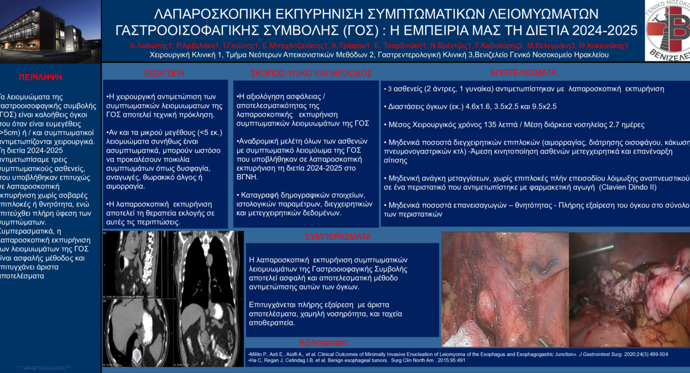 Χειρουργική Κλινική, Βενιζέλειο Γενικό Νοσοκομείο Ηρακλείου ePosters Λαλιώτης Άγγελος ΛΑΠΑΡΟΣΚΟΠΙΚΗ ΕΚΠΥΡΗΝΙΣΗ ΣΥΜΠΤΩΜΑΤΙΚΩΝ ΛΕΙΟΜΥΩΜΑΤΩΝ ΓΑΣΤΡΟΟΙΣΟΦΑΓΙΚΗΣ ΣΥΜΒΟΛΗΣ: H ΕΜΠΕΙΡΙΑ ΜΑΣ ΤΗ ΔΙΕΤΙΑ 2024-2025 / Χειρουργική παθήσεων ανώτερου πεπτικού