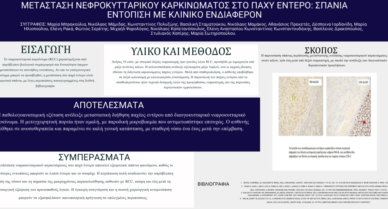 Μπρακούλια Μαρία ΜΕΤΑΣΤΑΣΗ ΝΕΦΡΟΚΥΤΤΑΡΙΚΟΥ ΚΑΡΚΙΝΩΜΑΤΟΣ ΣΤΟ ΠΑΧΥ ΕΝΤΕΡΟ: ΣΠΑΝΙΑ ΕΝΤΟΠΙΣΗ ΜΕ ΚΛΙΝΙΚΟ ΕΝΔΙΑΦΕΡΟΝ / Χειρουργική παθήσεων κατώτερου πεπτικού