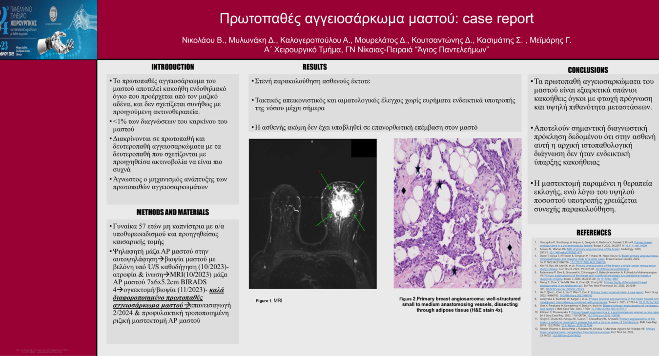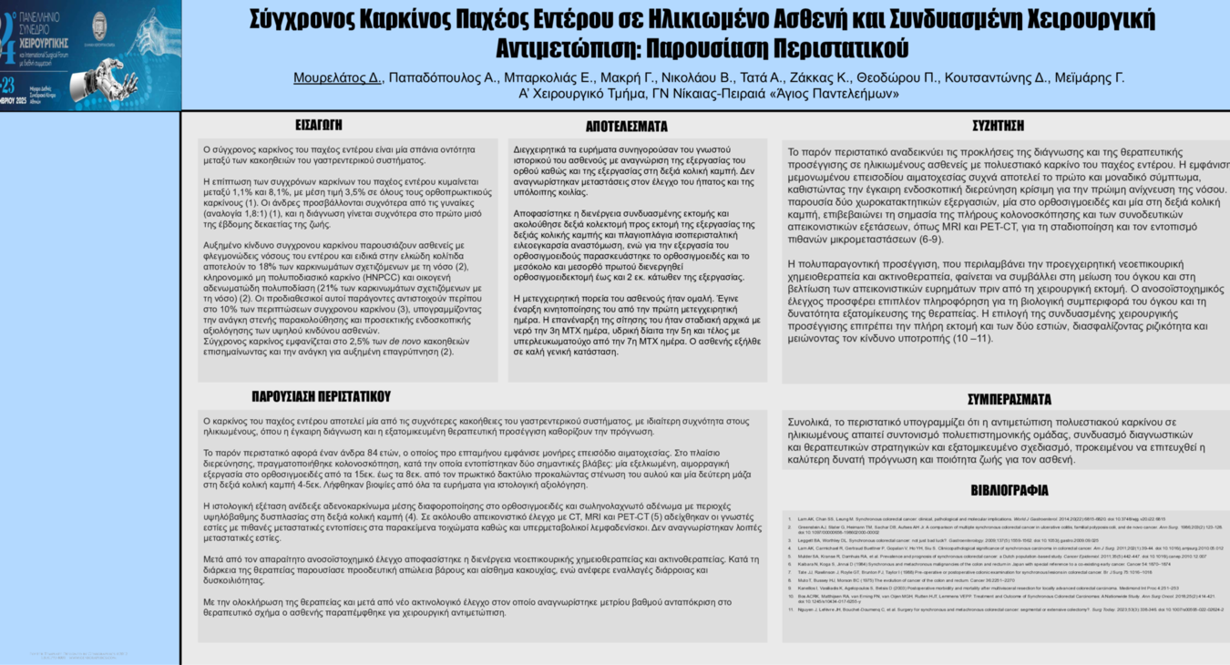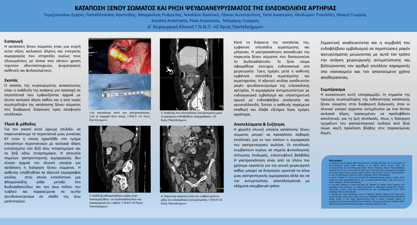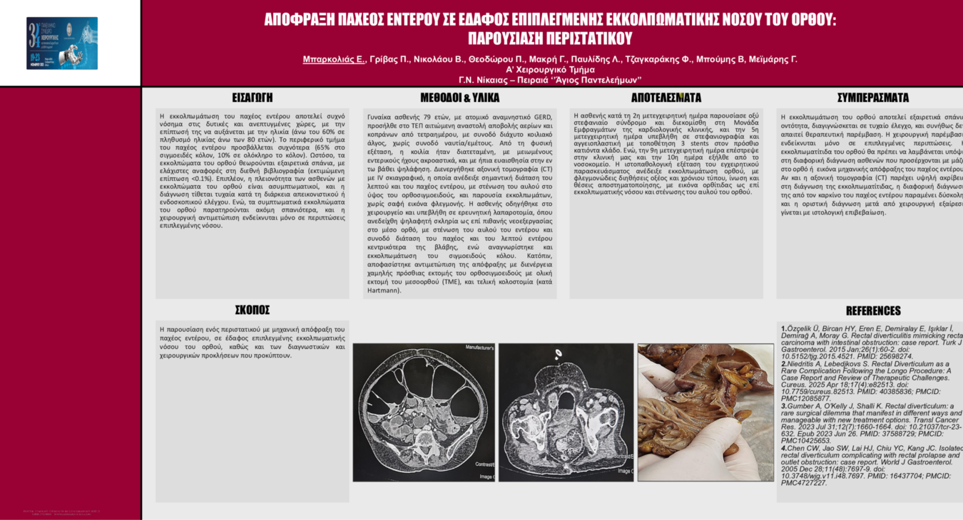 Α Χειρουργική Κλινική, Γενικό Κρατικό Νοσοκομείο Νίκαιας ePosters Νικολάου Βασιλική ΚΑΤΑΠΟΣΗ ΞΕΝΟΥ ΣΩΜΑΤΟΣ ΚΑΙ ΜΙΑ ΣΠΑΝΙΑ ΕΠΙΠΛΟΚΗ ΤΟΥ / Διάφορα θέματα Χειρουργικής Νικολάου Βασιλική ΑΠΟΦΡΑΚΤΙΚΟΣ ΕΙΛΕΟΣ ΠΑΧΕΟΣ ΕΝΤΕΡΟΥ ΛΟΓΩ ΕΚΚΟΛΠΩΜΑΤΩΣΗΣ ΟΡΘΟΥ: ΠΑΡΟΥΣΙΑΣΗ ΠΕΡΙΣΤΑΤΙΚΟΥ / Επείγουσα χειρουργική Νικολάου Βασιλική ΣΤΡΩΜΑΤΙΚΟΣ ΟΓΚΟΣ ΟΡΘΟΥ, ΜΙΑ ΣΠΑΝΙΑ ΕΝΤΟΠΙΣΗ / Χειρουργική παθήσεων κατώτερου πεπτικού Νικολάου Βασιλική ΣΥΓΧΡΟΝΟΣ ΚΑΡΚΙΝΟΣ ΠΑΧΕΟΣ ΕΝΤΕΡΟΥ ΣΕ ΗΛΙΚΙΩΜΕΝΟ ΑΣΘΕΝΗ ΚΑΙ ΣΥΝΔΥΑΣΜΕΝΗ ΧΕΙΡΟΥΡΓΙΚΗ ΑΝΤΙΜΕΤΩΠΙΣΗ: ΠΑΡΟΥΣΙΑΣΗ ΠΕΡΙΣΤΑΤΙΚΟΥ / Χειρουργική παθήσεων κατώτερου πεπτικού Νικολάου Βασιλική ΠΡΩΤΟΠΑΘΕΣ ΑΓΓΕΙΟΣΑΡΚΩΜΑ ΜΑΣΤΟΥ: CASE REPORT / Χειρουργική παθήσεων μαστού 2 προβολές