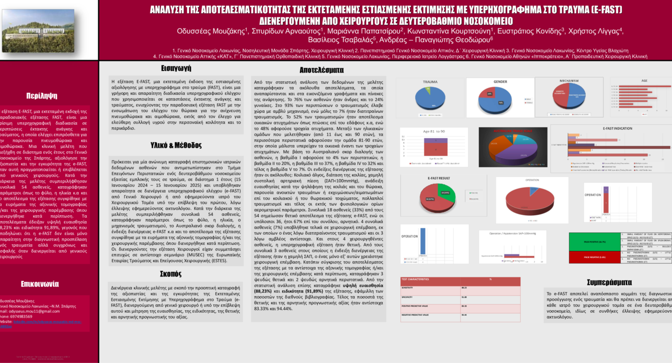 Οδυσσέας Μουζάκης ΑΝΑΛΥΣΗ ΤΗΣ ΑΠΟΤΕΛΕΣΜΑΤΙΚΟΤΗΤΑΣ ΤΗΣ ΕΚΤΕΤΑΜΕΝΗΣ ΕΣΤΙΑΣΜΕΝΗΣ ΕΚΤΙΜΗΣΗΣ ΜΕ ΥΠΕΡΗΧΟΓΡΑΦΗΜΑ ΣΤΟ ΤΡΑΥΜΑ (E-FAST) ΔΙΕΝΕΡΓΟΥΜΕΝΗ ΑΠΟ ΧΕΙΡΟΥΡΓΟΥΣ ΣΕ ΔΕΥΤΕΡΟΒΑΘΜΙΟ ΝΟΣΟΚΟΜΕΙΟ / Τραύμα και σύνθετες κακώσεις στον πολυτραυματία
