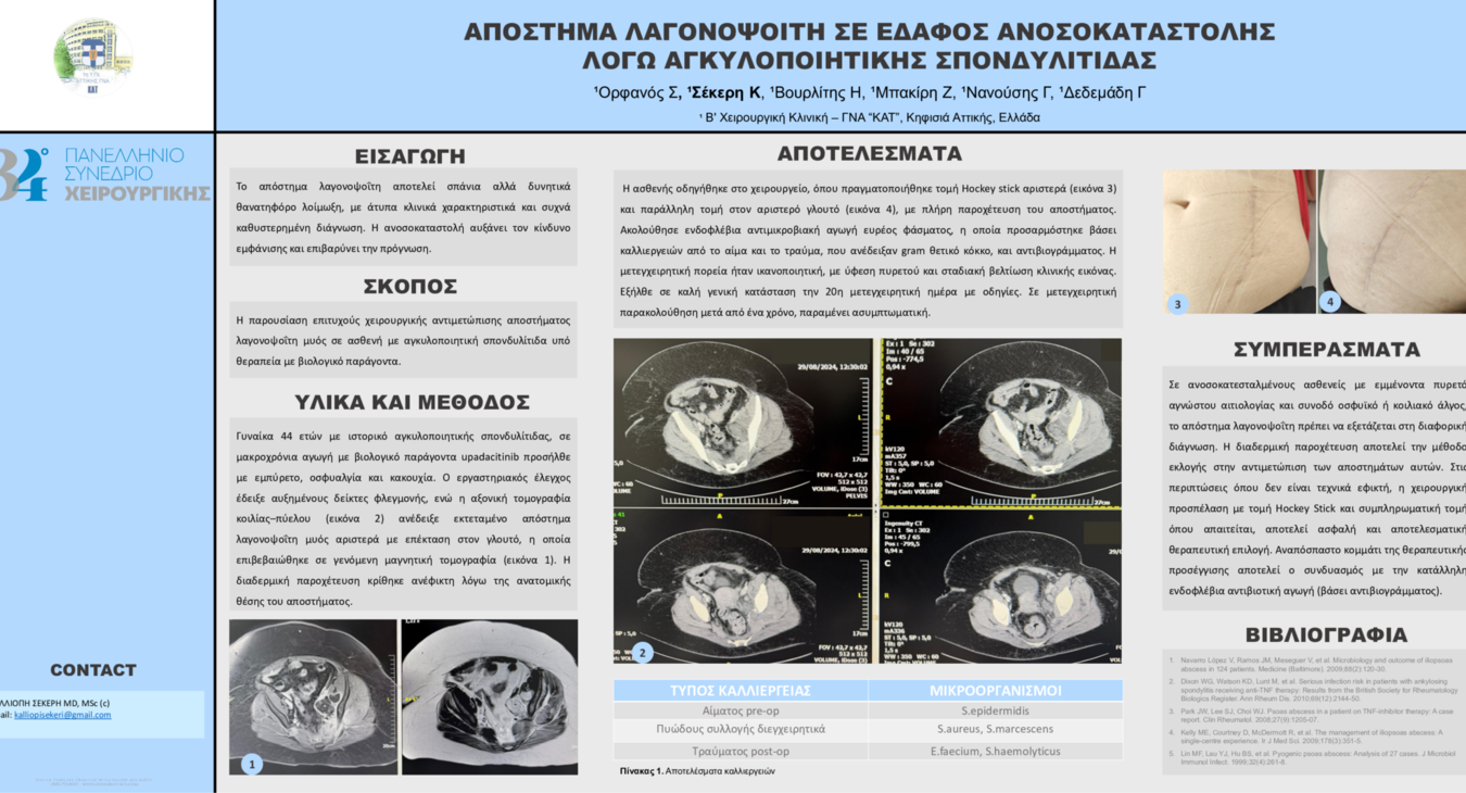 Ορφανός Σταμάτιος ΑΠΟΣΤΗΜΑ ΛΑΓΟΝΟΨΟΪΤΗ ΣΕ ΕΔΑΦΟΣ ΑΝΟΣΟΚΑΤΑΣΤΟΛΗΣ ΛΟΓΩ ΑΓΚΥΛΟΠΟΙΗΤΙΚΗΣ ΣΠΟΝΔΥΛΙΤΙΔΑΣ / Χειρουργικές λοιμώξεις