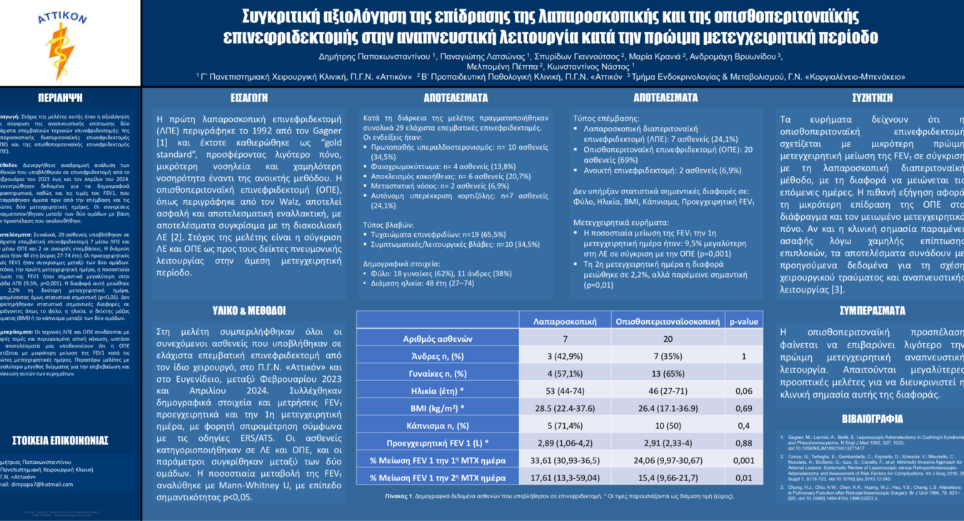 Γ' Πανεπιστημιακή Χειρουργική Κλινική, Π.Γ.Ν. "Αττικόν" ePosters Παπακωνσταντίνου Δημήτριος Συγκριτική αξιολόγηση της επίδρασης της λαπαροσκοπικής και της οπισθοπεριτοναϊκής επινεφριδεκτομής στην αναπνευστική λειτουργία κατά την πρώιμη μετεγχειρητική περίοδο / Χειρουργική παθήσεων ενδοκρινών αδένων 1 προβολή