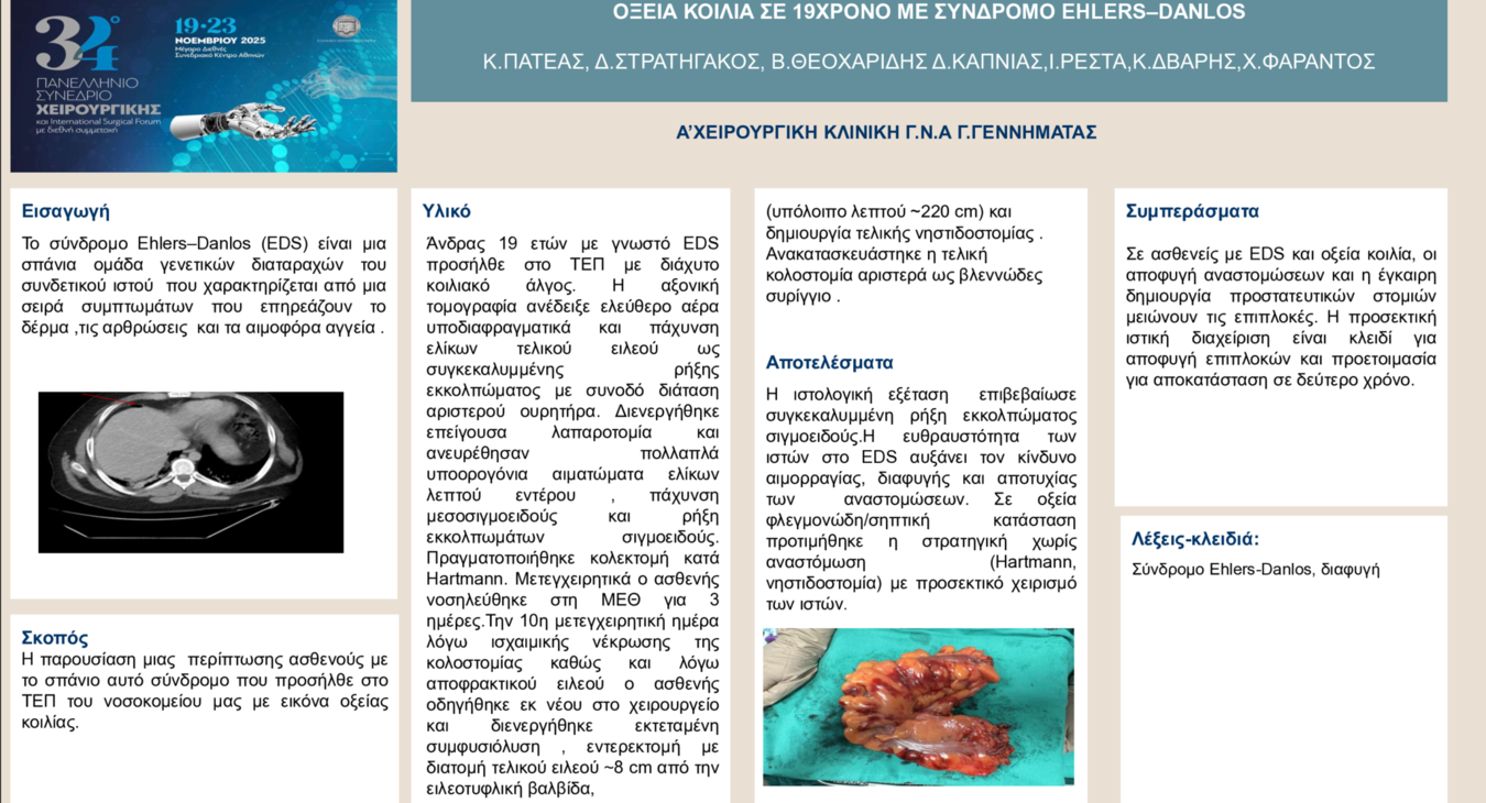 Α'Χειρουργική Κλινική Γ.Ν.Α 'Γ.ΓΕΝΝΗΜΑΤΑΣ' ePosters Πατέας Κωνσταντίνος ΓΆΓΓΡΑΙΝΑ FOURNIER ΩΣ ΠΡΏΤΗ ΕΚΔΉΛΩΣΗ ΚΑΡΚΊΝΟΥ ΚΑΤΏΤΕΡΟΥ ΟΡΘΟΎ: ΠΑΡΟΥΣΊΑΣΗ ΠΕΡΙΣΤΑΤΙΚΟΎ. / Επείγουσα χειρουργική Πατέας Κωνσταντίνος ΟΞΕΊΑ ΚΟΙΛΊΑ ΣΕ 19ΧΡΟΝΟ ΜΕ ΣΎΝΔΡΟΜΟ EHLERS–DANLOS / Επείγουσα χειρουργική