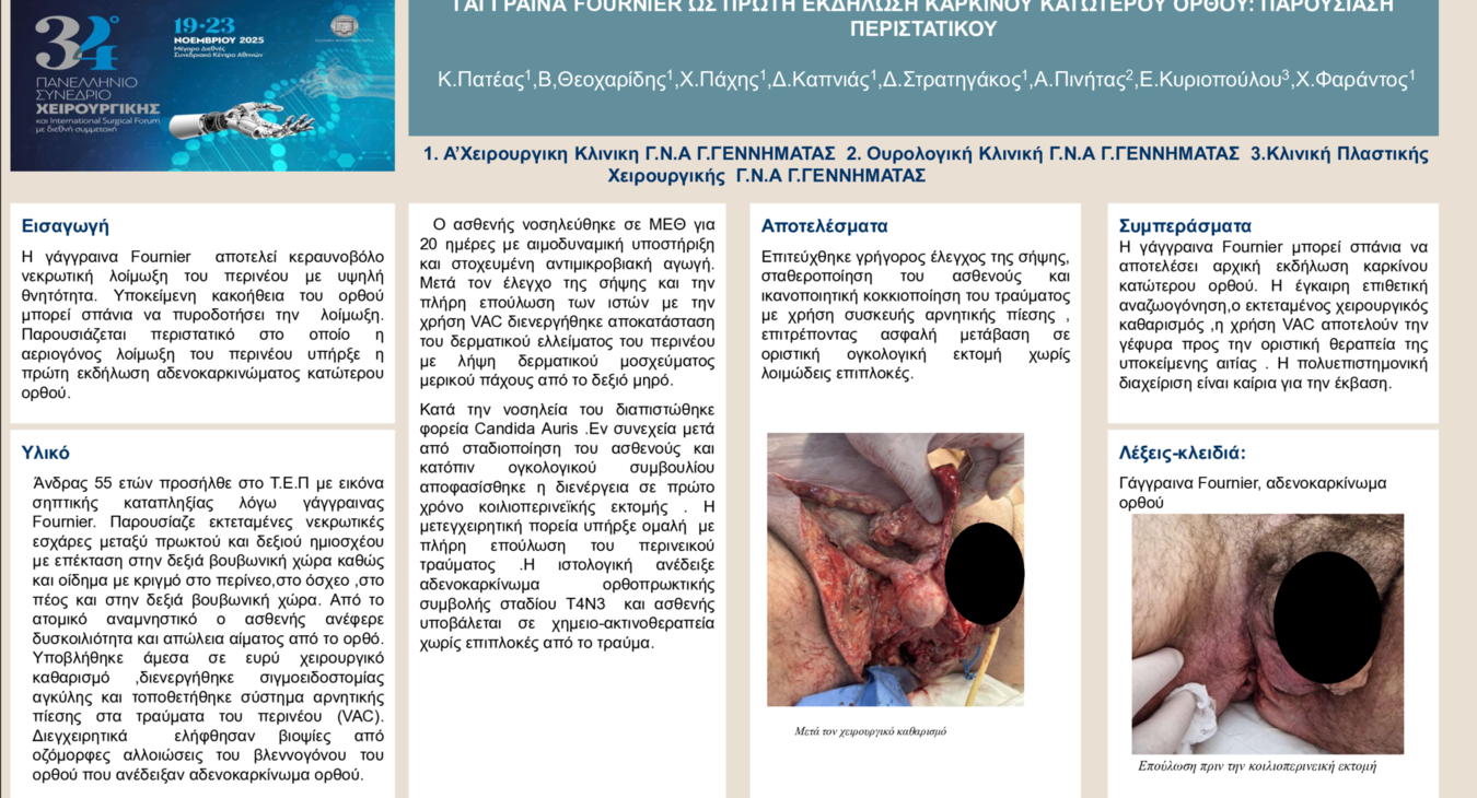 Πατέας Κωνσταντίνος ΓΆΓΓΡΑΙΝΑ FOURNIER ΩΣ ΠΡΏΤΗ ΕΚΔΉΛΩΣΗ ΚΑΡΚΊΝΟΥ ΚΑΤΏΤΕΡΟΥ ΟΡΘΟΎ: ΠΑΡΟΥΣΊΑΣΗ ΠΕΡΙΣΤΑΤΙΚΟΎ. / Επείγουσα χειρουργική