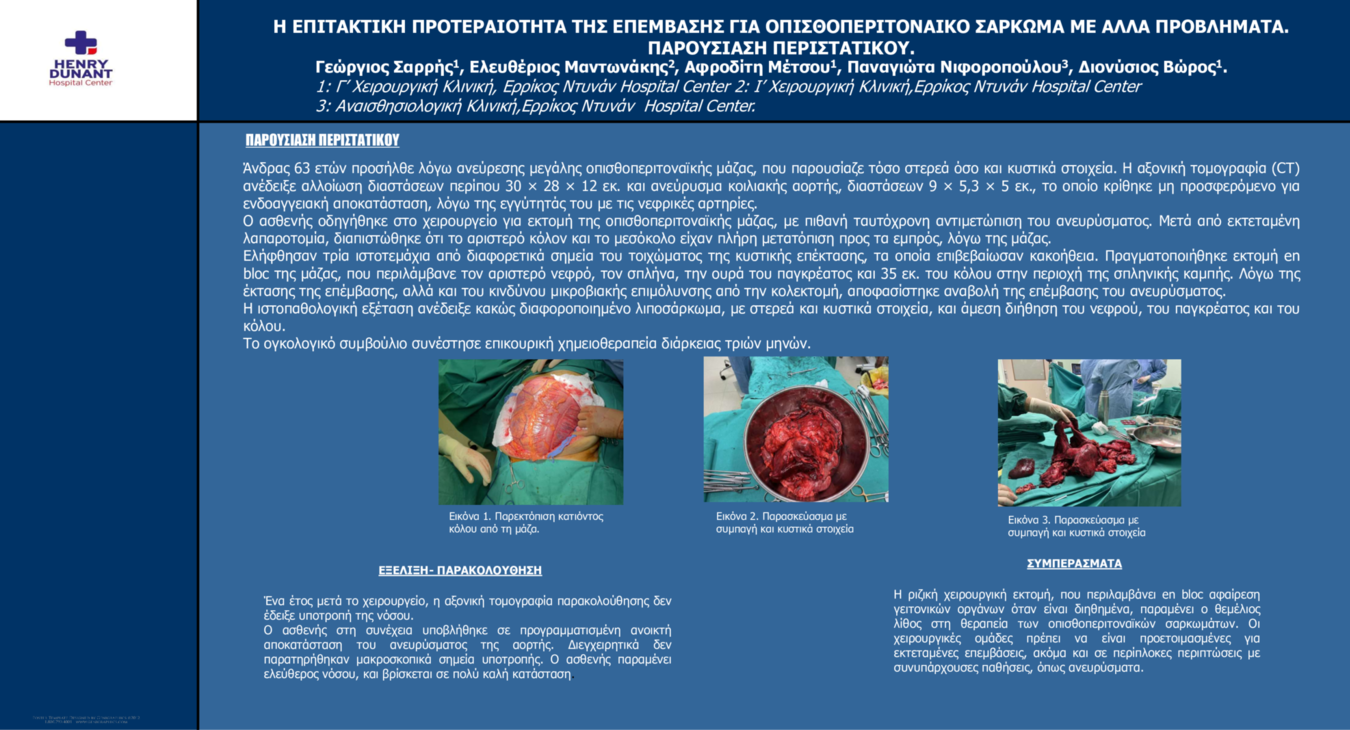 Ερρικος Ντυναν Hospital Center ePosters Σαρρης Γεωργιος Η ΕΠΙΤΑΚΤΙΚΗ ΠΡΟΤΕΡΑΙΟΤΗΤΑ ΤΗΣ ΕΠΕΜΒΑΣΗΣ ΓΙΑ ΟΠΙΣΘΟΠΕΡΙΤΟΝΑΙΚΟ ΣΑΡΚΩΜΑ ΜΕ ΑΛΛΑ ΠΡΟΒΛΗΜΑΤΑ. ΠΑΡΟΥΣΙΑΣΗ ΠΕΡΙΣΤΑΤΙΚΟΥ. / Διάφορα θέματα Χειρουργικής