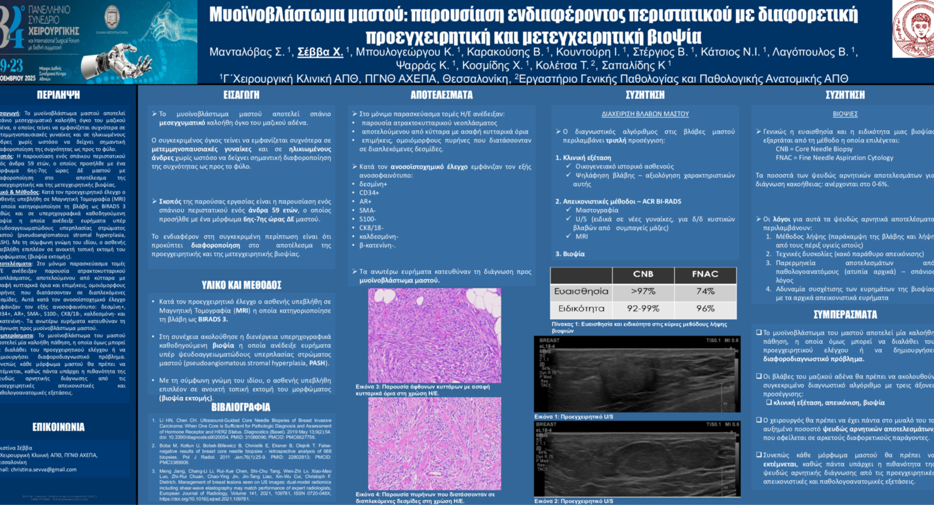 Γ’ Χειρουργική Κλινική ΑΠΘ, Πανεπιστημιακό Γενικό Νοσοκομείο Θεσσαλονίκης ΑΧΕΠΑ, Αριστοτέλειο Πανεπιστήμιο Θεσσαλονίκης ePosters Σέββα Χριστίνα ΜΥΟΪΝΟΒΛΑΣΤΩΜΑ ΜΑΣΤΟΥ: ΠΑΡΟΥΣΙΑΣΗ ΕΝΔΙΑΦΕΡΟΝΤΟΣ ΠΕΡΙΣΤΑΤΙΚΟΥ ΜΕ ΔΙΑΦΟΡΕΤΙΚΗ ΠΡΟΕΓΧΕΙΡΗΤΙΚΗ ΚΑΙΜΕΤΕΓΧΕΙΡΗΤΙΚΗ ΒΙΟΨΙΑ / Χειρουργική παθήσεων μαστού
