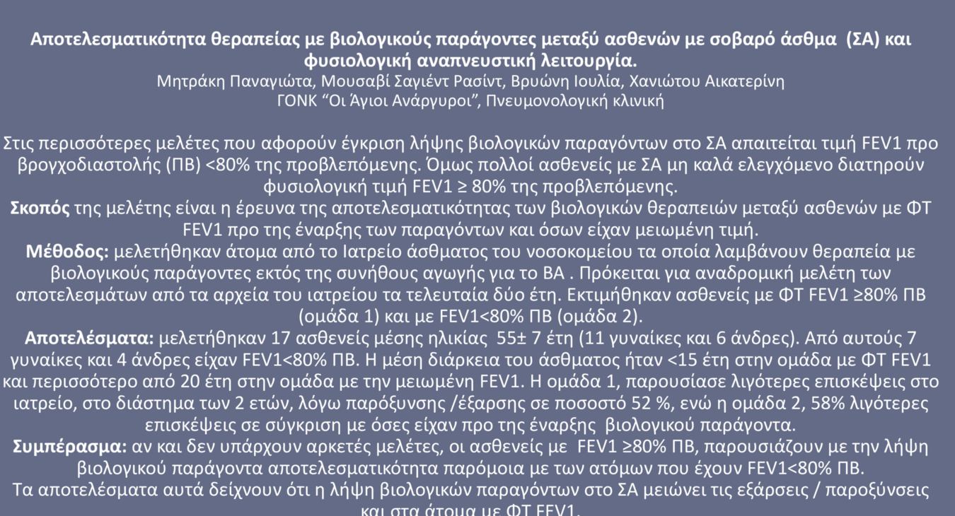 ΑΠΟΤΕΛΕΣΜΑΤΙΚΟΤΗΤΑ ΘΕΡΑΠΕΙΑΣ ΜΕ ΒΙΟΛΟΓΙΚΟΥΣ ΠΑΡΑΓΟΝΤΕΣ ΜΕΤΑΞΥ ΑΣΘΕΝΩΝ ΜΕ ΒΡΟΓΧΙΚΟ ΑΣΘΜΑ (ΣΑ) ΚΑΙ ΦΥΣΙΟΛΟΓΙΚΗ ΑΝΑΠΝΕΥΣΤΙΚΗ ΛΕΙΤΟΥΡΓΙΑ.