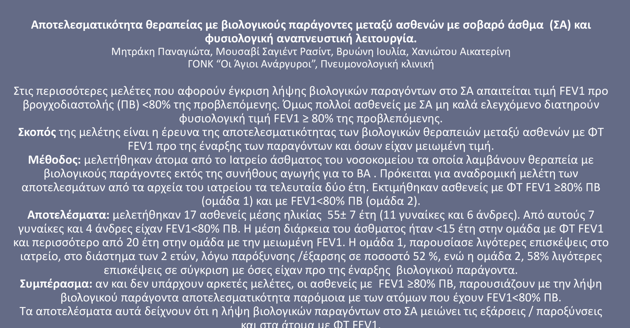 Συμπέρασμα: αν και δεν υπάρχουν αρκετές μελέτες, οι ασθενείς με FEV1 ≥80% ΠΒ, παρουσιάζουν με την λήψη βιολογικού παράγοντα αποτελεσματικότητα παρόμοια με των ατόμων που έχουν FEV1<80% ΠΒ.
