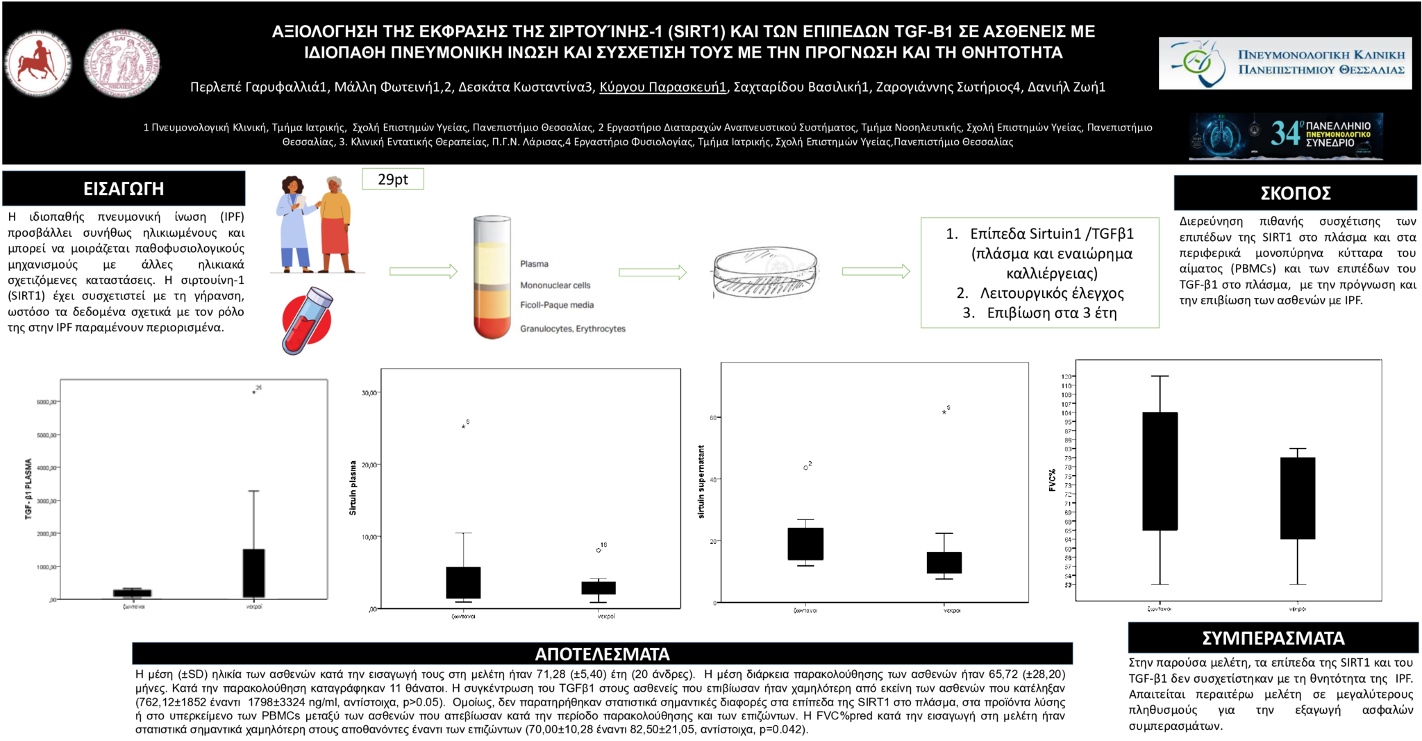 Μέθοδος: Στη μελέτη συμμετείχαν 29 ασθενείς με IPF. Στους συμμετέχοντες αξιολογήθηκαν τα επίπεδα της SIRT1 στο πλάσμα, στα προϊόντα λύσης των PBMCs, καθώς και στο υπερκείμενο των καλλιεργειών PBMCs. Επιπλέον, μετρήθηκε η συγκέντρωση του TGF-β1 στο πλάσμα. Οι παραπάνω μετρήσεις πραγματοποιήθηκαν κατά την εισαγωγή των ασθενών στη μελέτη. Kατόπιν οι ασθενείς παρακολουθήθηκαν προοπτικά για τουλάχιστον τρία έτη και καταγράφηκαν οι θάνατοι που σημειώθηκαν κατά τη διάρκεια της παρακολούθησης.