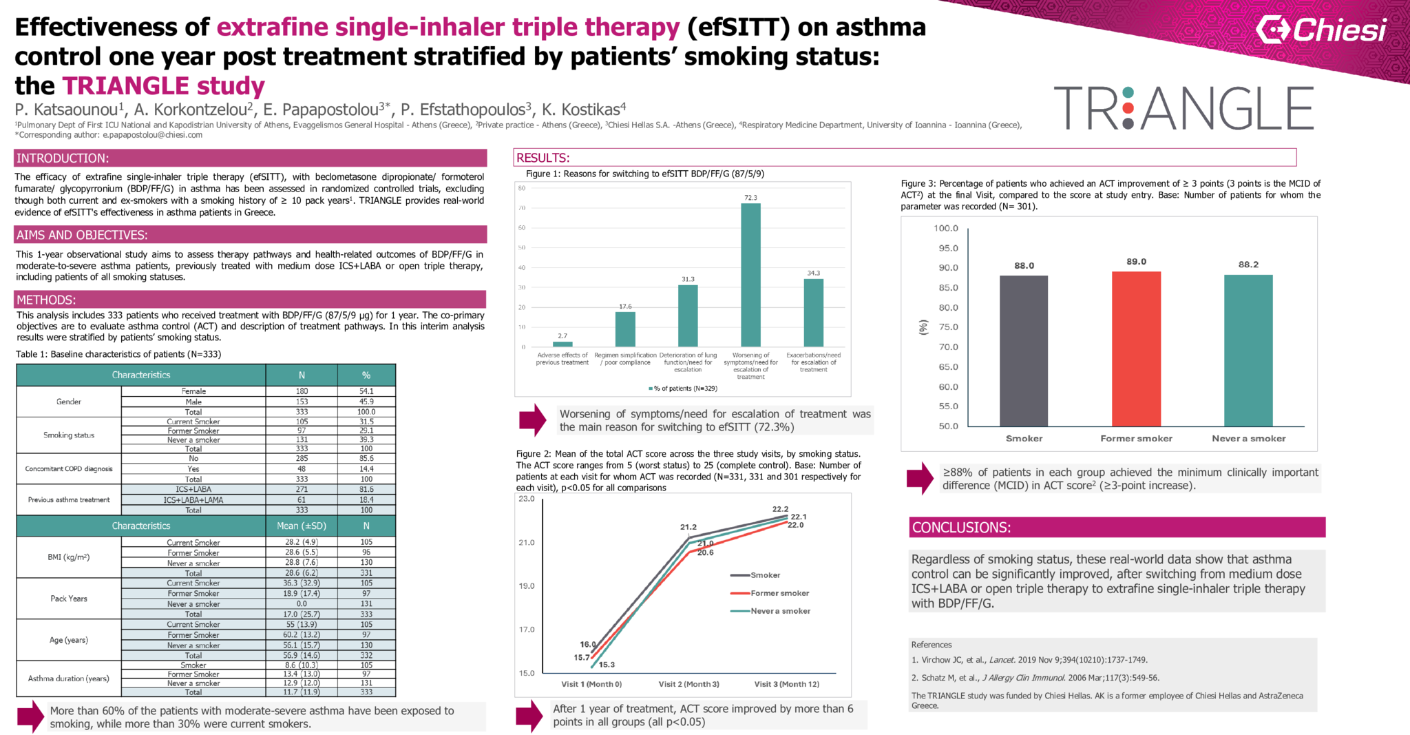 This analysis includes 333 patients who received treatment with BDP/FF/G (87/5/9 µg) for 1 year. The co-primary objective is to evaluate asthma control (ACT) and in this interim analysis results were stratified by patients’ smoking status.